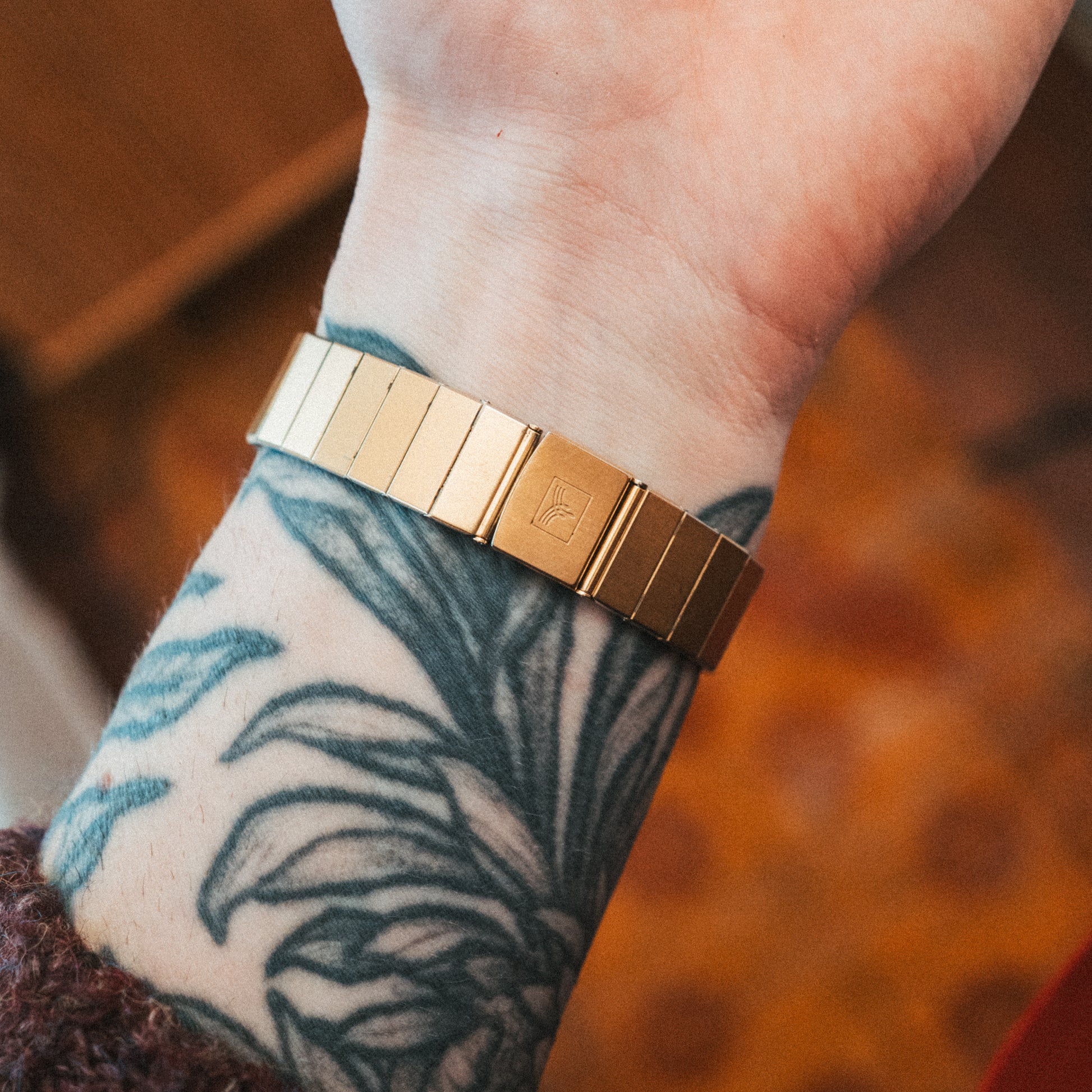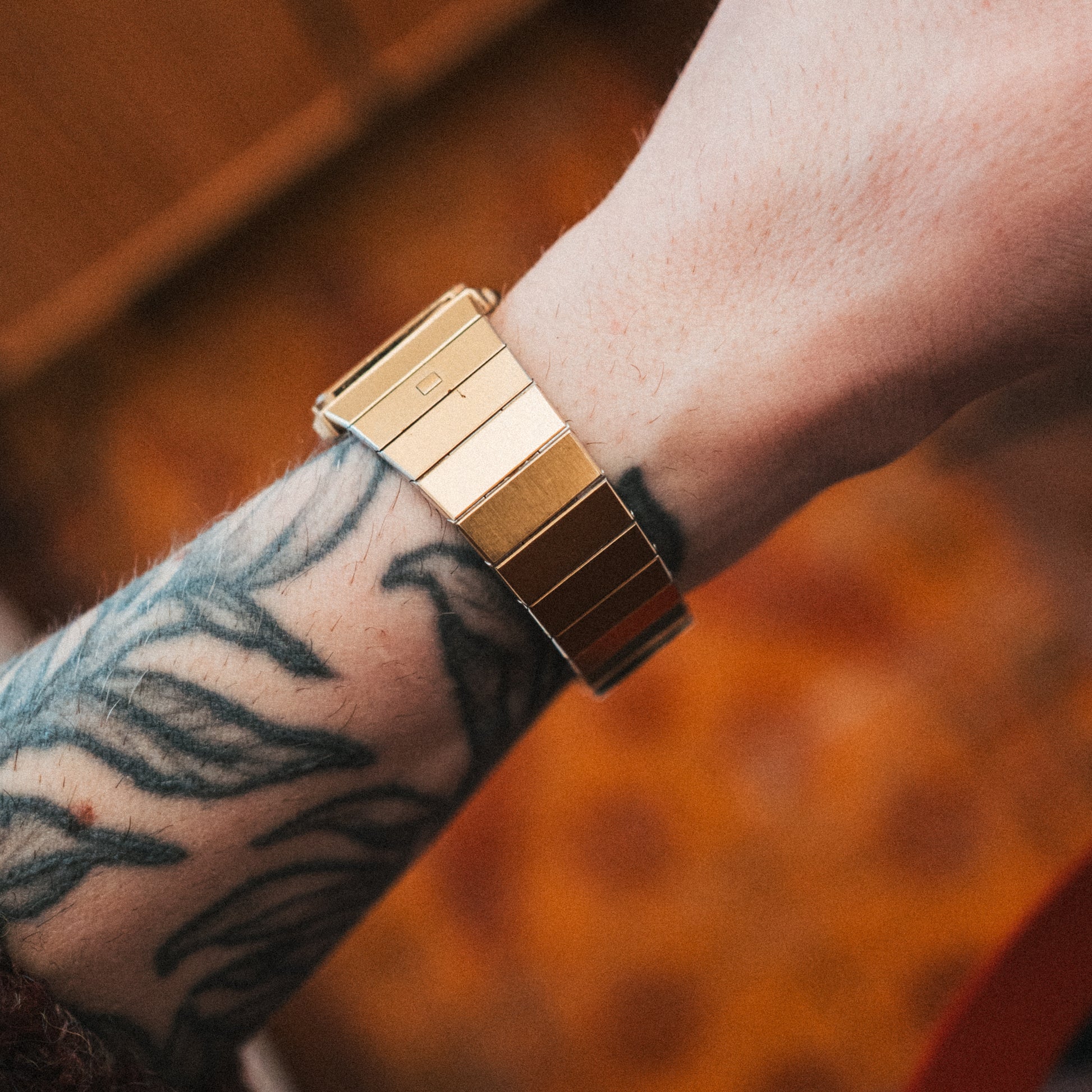 The rectangular case in two-tone stainless steel and gold-tone finish houses both the quartz movement and the mechanical alarm module, a feature that made these watches practical tools before smartphones took over. The champagne dial with applied markers and alarm indicator maintains clean legibility, while the integrated bracelet flows seamlessly from case to wrist.