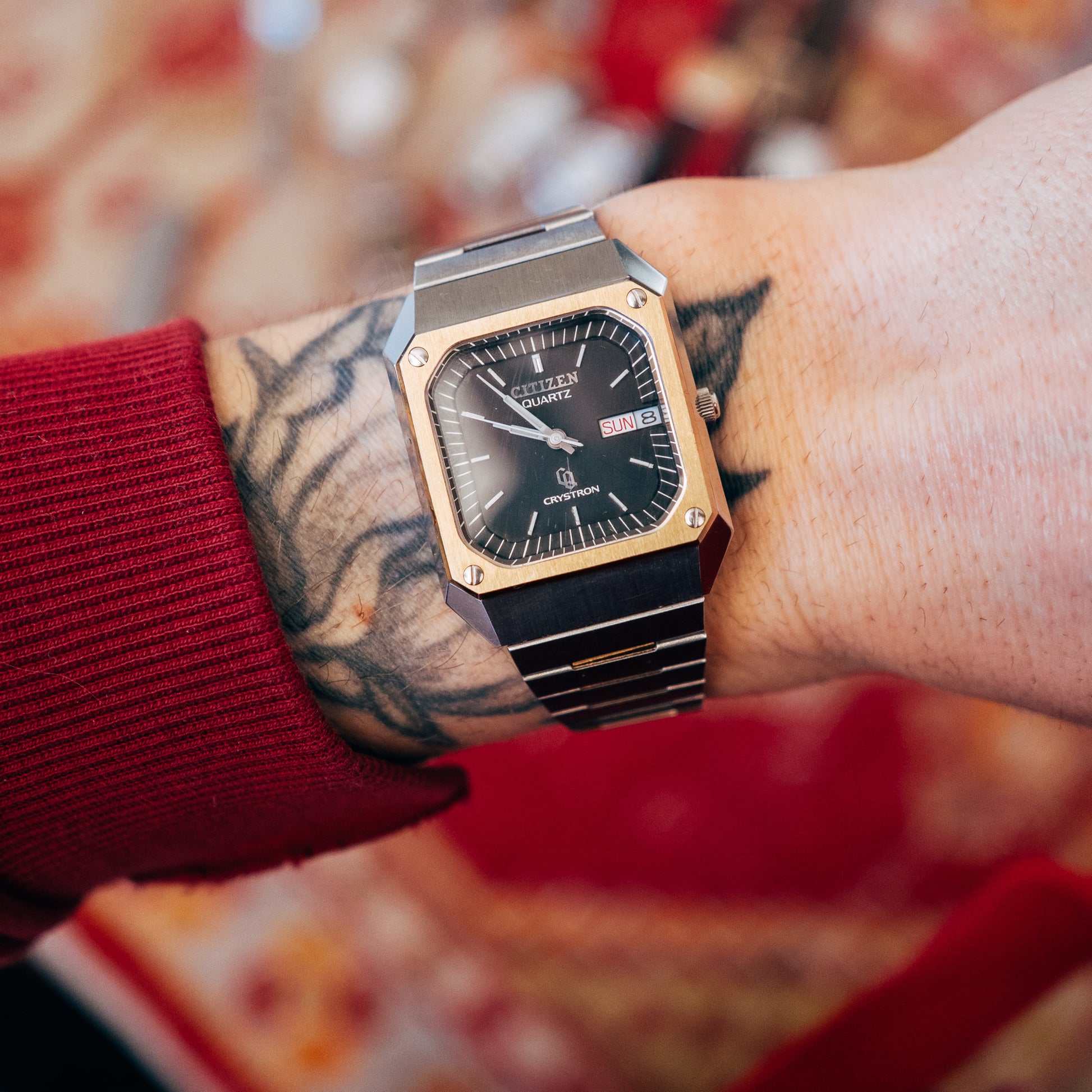 A bold neo-vintage Citizen Crystron with distinctive two-tone styling and a striking square case design.
