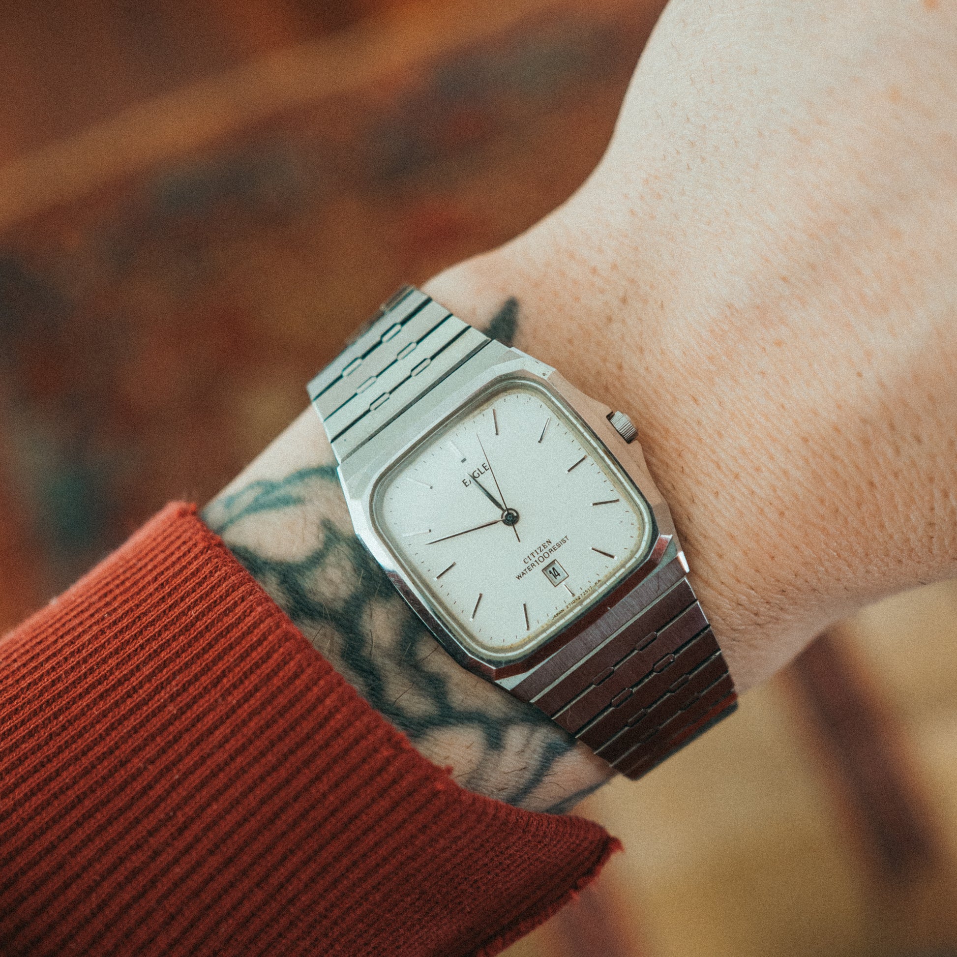 Special Note: Wearing its original Citizen bracelet — a wide, flat ladder-link in brushed steel with a consistent satin finish and a clean, integrated taper from case to clasp. The engraved Citizen fold-over clasp is polished and secure. The case is completely unpolished, preserving every original surface and the soft geometry of the cushion-rectangular shape. The cream dial is clean — slim silver baton indices, a date window at 6 o'clock, and the Eagle name printed above the Citizen logo with "Water 100 Resist" noted below — a detail that speaks to the watch's original positioning as a capable everyday piece. Great condition throughout.