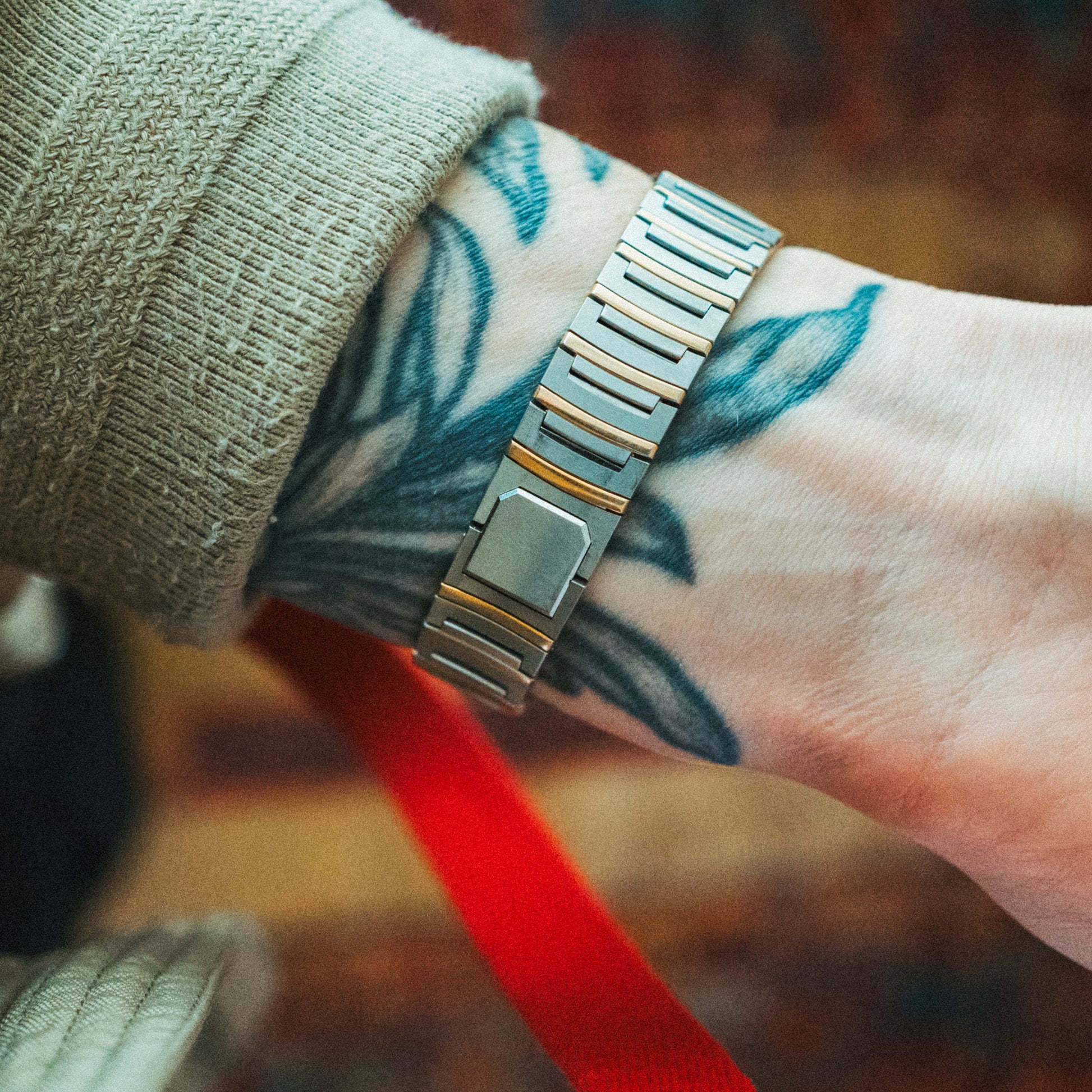 The rectangular case shape — with its clean lines and architectural proportions — speaks to the refined sensibility of 1980s luxury watches, when quartz movements allowed for slimmer profiles and more elegant silhouettes. The two-tone treatment adds versatility, making this a watch that transitions effortlessly from business to formal occasions.