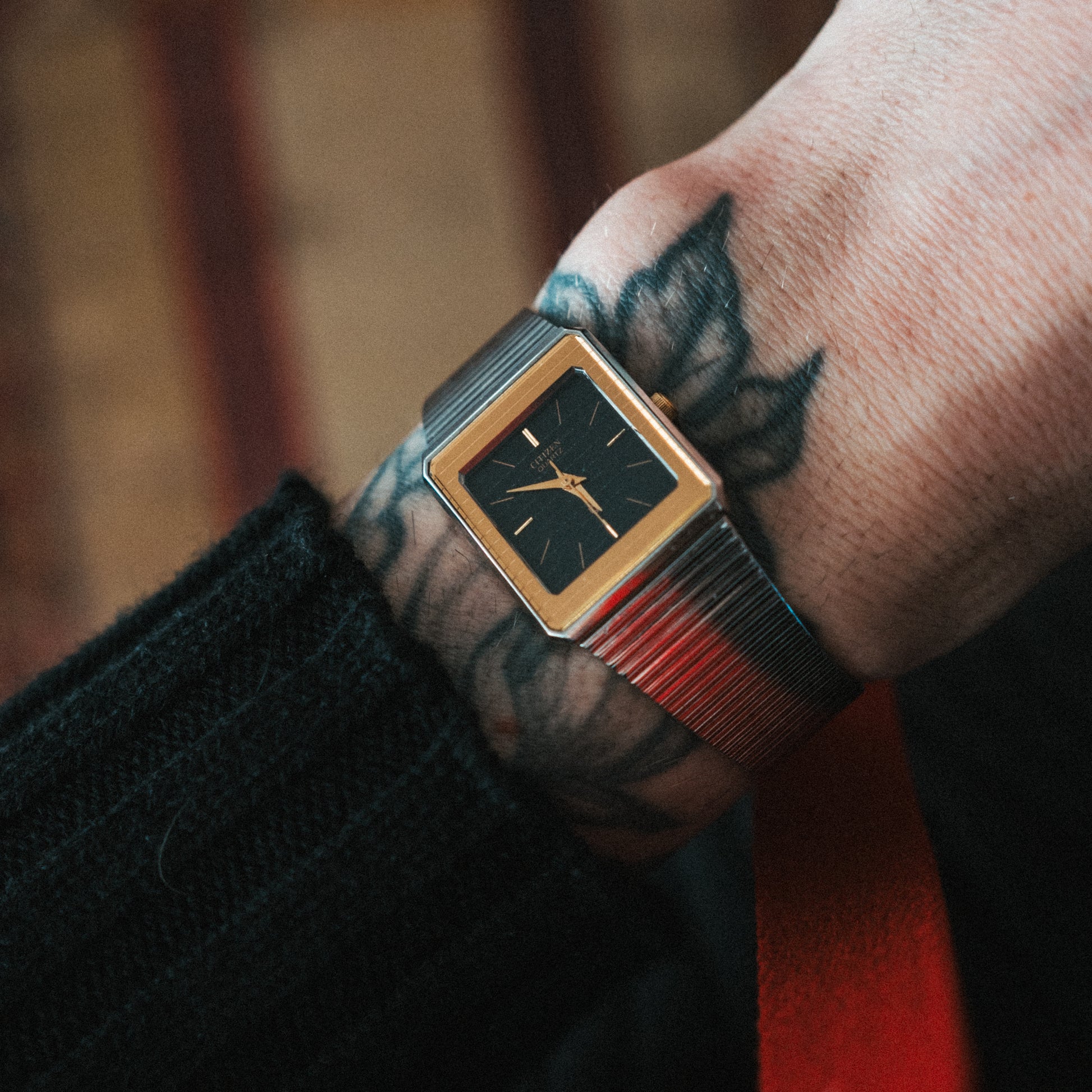 A beautifully preserved Citizen Quartz that exemplifies 1980s elegance in its purest form. This piece features a two-tone stainless steel and gold case, giving it that perfect blend of warmth and sophistication. The black dial with gold markers and hands adds contrast and depth, creating a sleek aesthetic that feels both refined and confident.