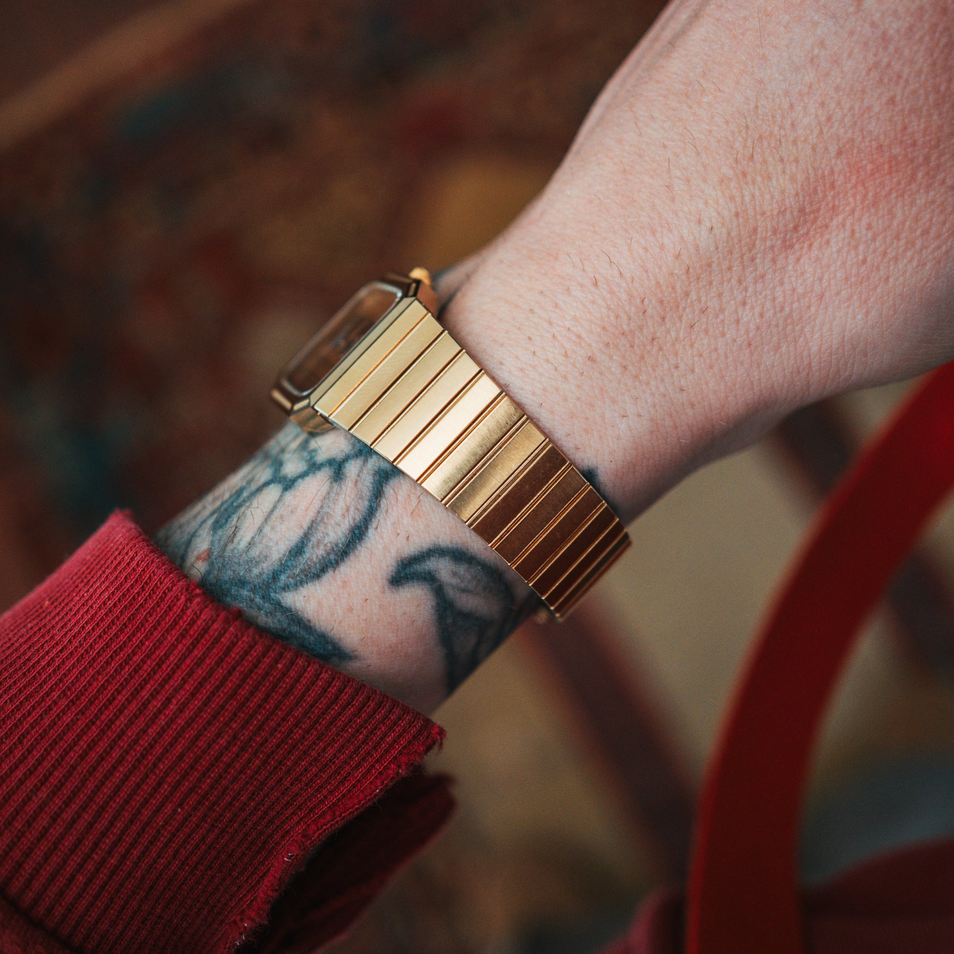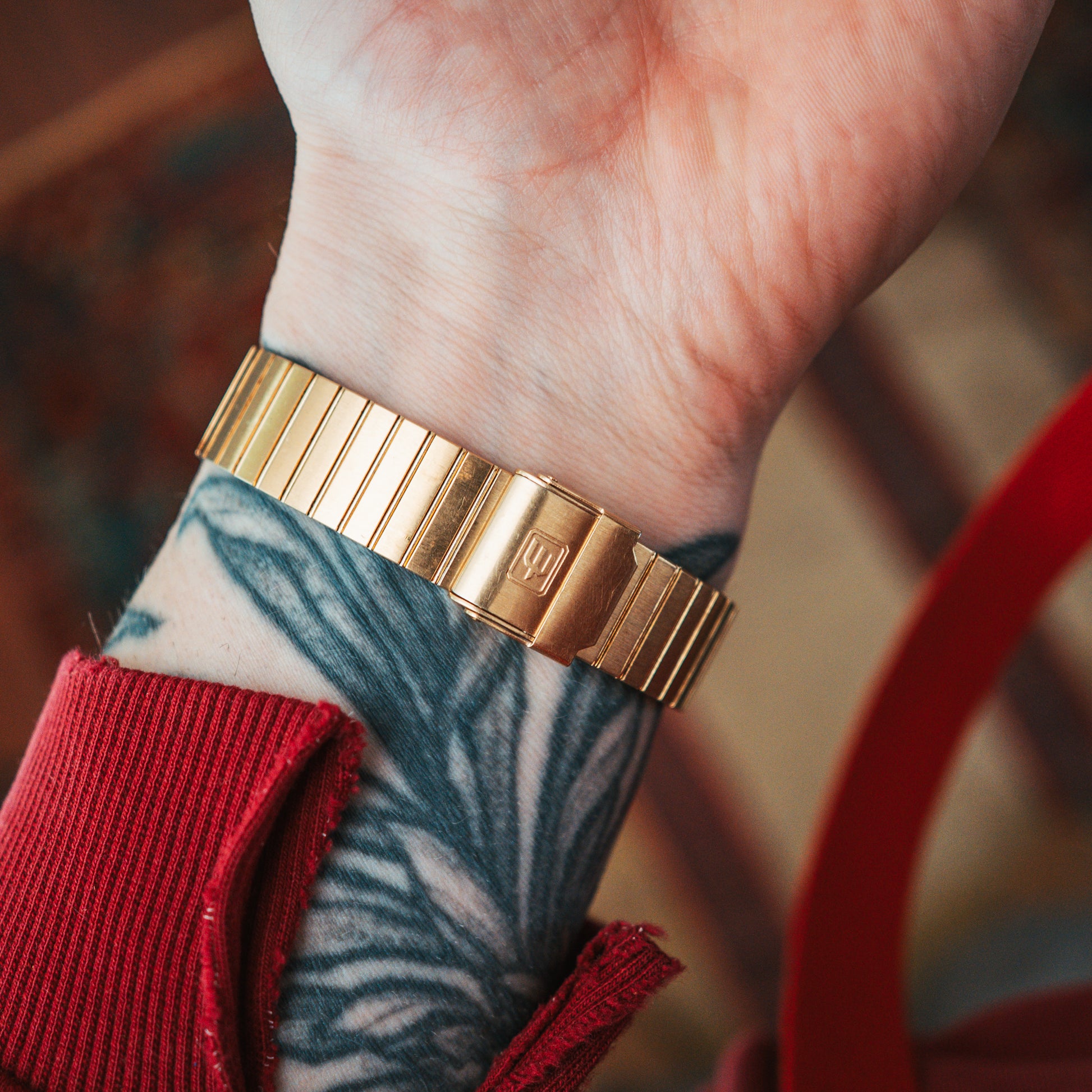 Special Note: Tiger's eye is a chatoyant gemstone — meaning it shifts and shimmers as light moves across it, revealing bands of amber, gold, and deep brown that seem to glow from within. Under direct light, the dial comes alive with a silky, almost liquid movement that no printed dial can replicate. The stone was hand-cut and fitted to the Citizen Exceed case — a square gold case with a beveled bezel and a crown at 3 o'clock. The dial carries the Citizen and Exceed logos in electric blue, a period-correct detail that adds a pop of color against the warm stone. The bracelet is a wide, ribbed gold expansion band — polished flat links that catch light in parallel lines — finished with a Citizen-stamped fold-over clasp on the reverse. This is wearable art. There is no other one like it.