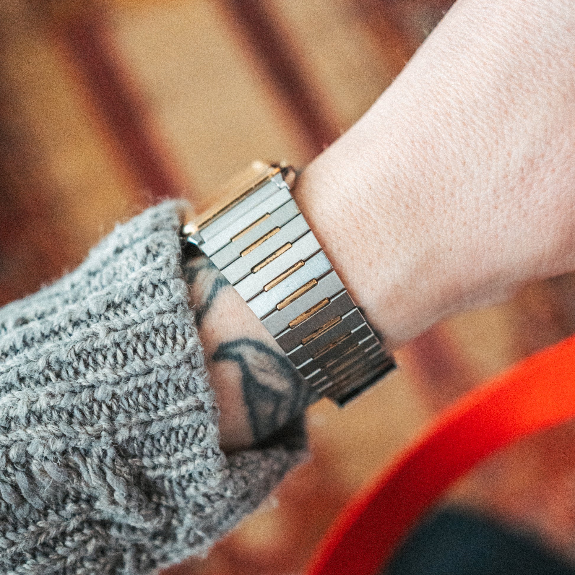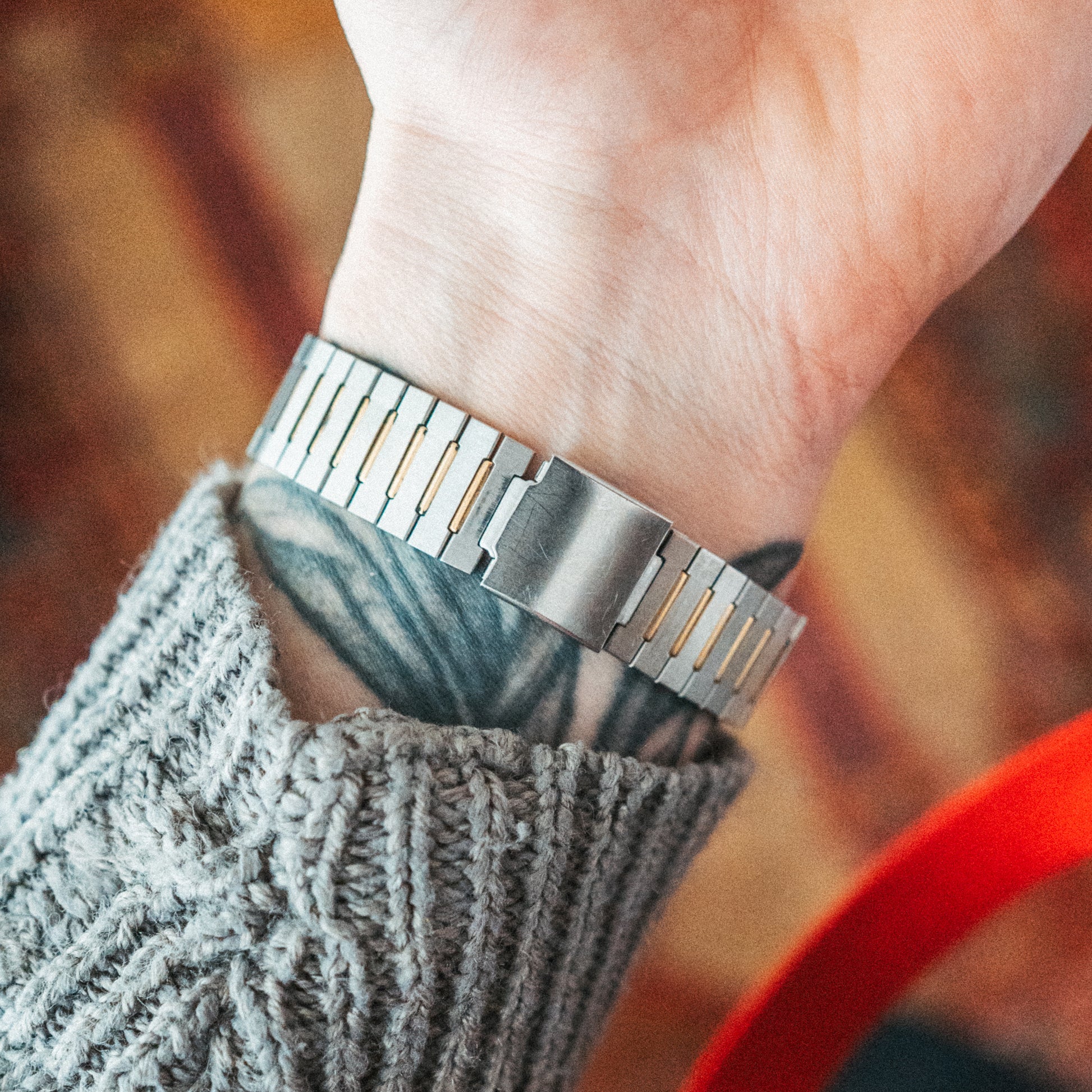 Bracelet: Integrated two-tone bracelet with matching gold and silver links. Adjustable bracelet, comfortably fitting my 17.5cm wrist or smaller.