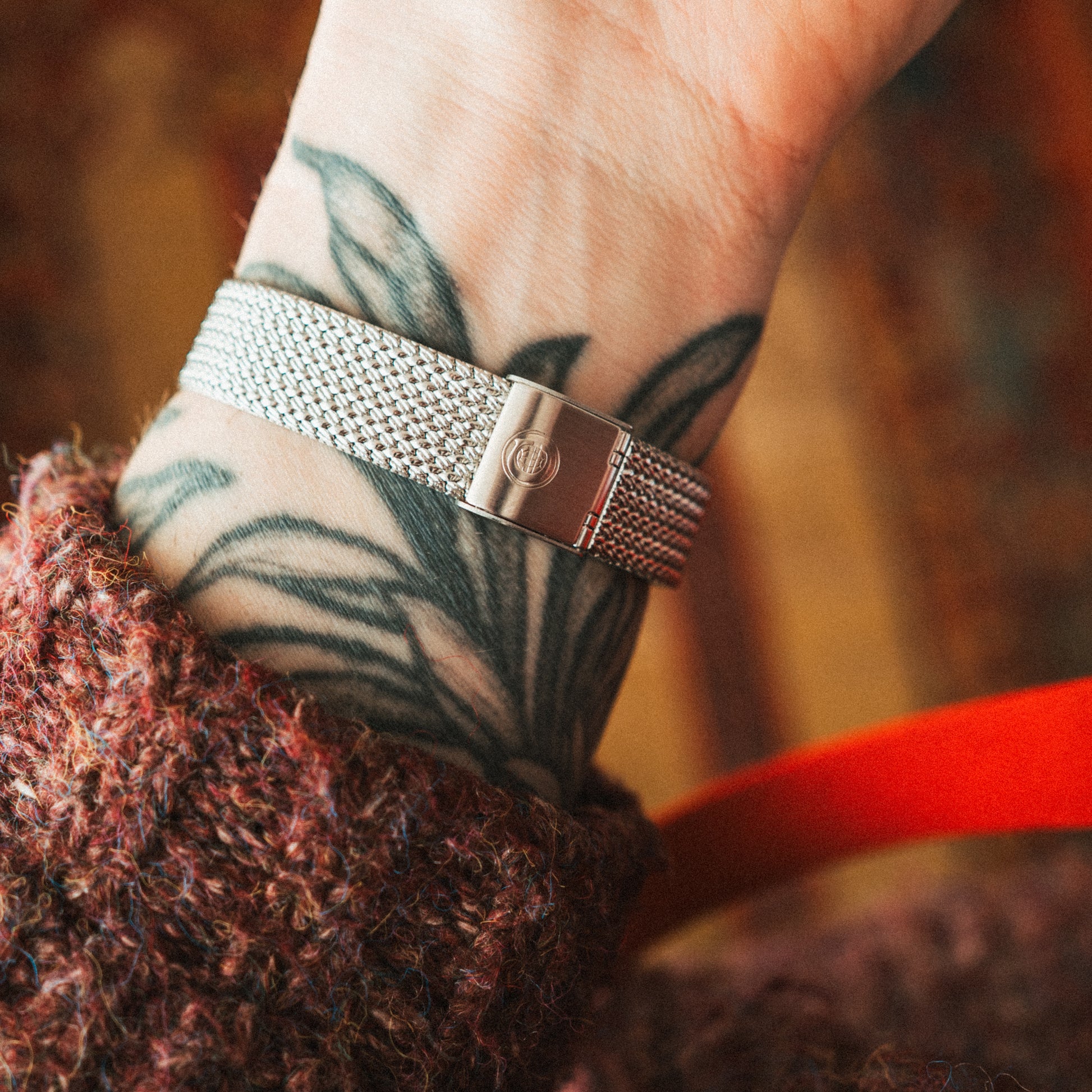 A rare neo-vintage find from CYMA's quartz era, this piece combines classic Swiss design with modern reliability. The rectangular case features clean lines and a polished finish, while the champagne dial displays Roman numeral hour markers with elegant simplicity. The integrated mesh bracelet flows seamlessly from case to clasp, creating a unified aesthetic that's both refined and versatile.