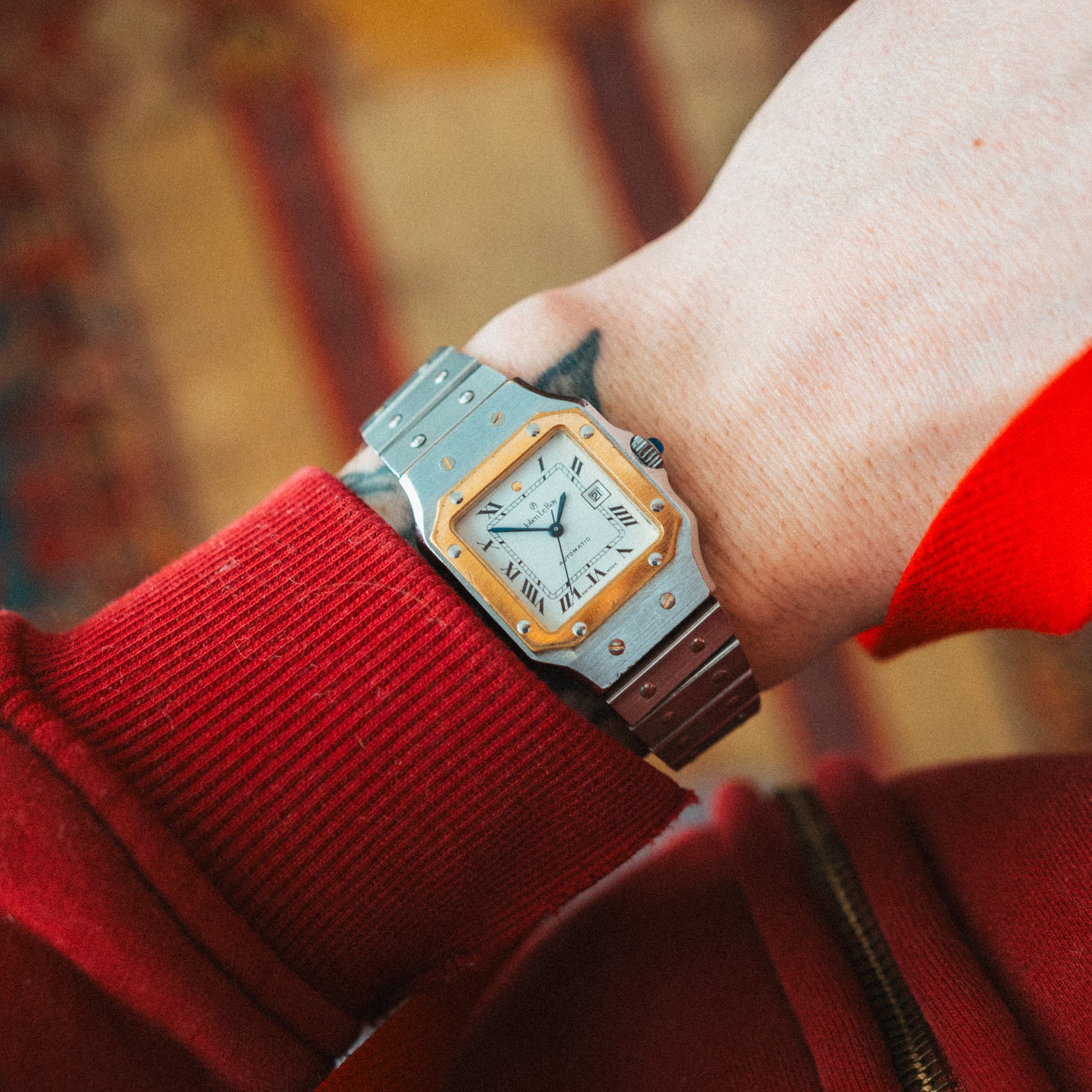 A refined, elegant Julien LeRoy with that unmistakable Swiss design sophistication and a stunning all-steel aesthetic. The square case has real presence — brushed steel finish with clean, geometric lines and those signature screw details that give it an industrial, luxury-inspired look.
