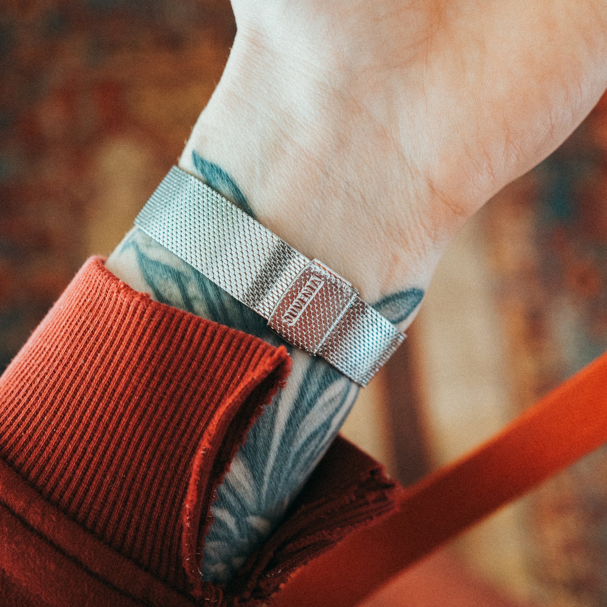 Special Note: All-matching silver mesh bracelet and Juvenia-stamped buckle — the fine woven mesh drapes the wrist with a softness that contrasts beautifully against the organic warmth of the burl wood dial. The cushion-shaped case frames the dial with architectural precision, a hallmark of Juvenia’s Swiss design language. The hand-winding mechanical movement inside is a reminder that this piece was built to last — and has. A true one-of-one.