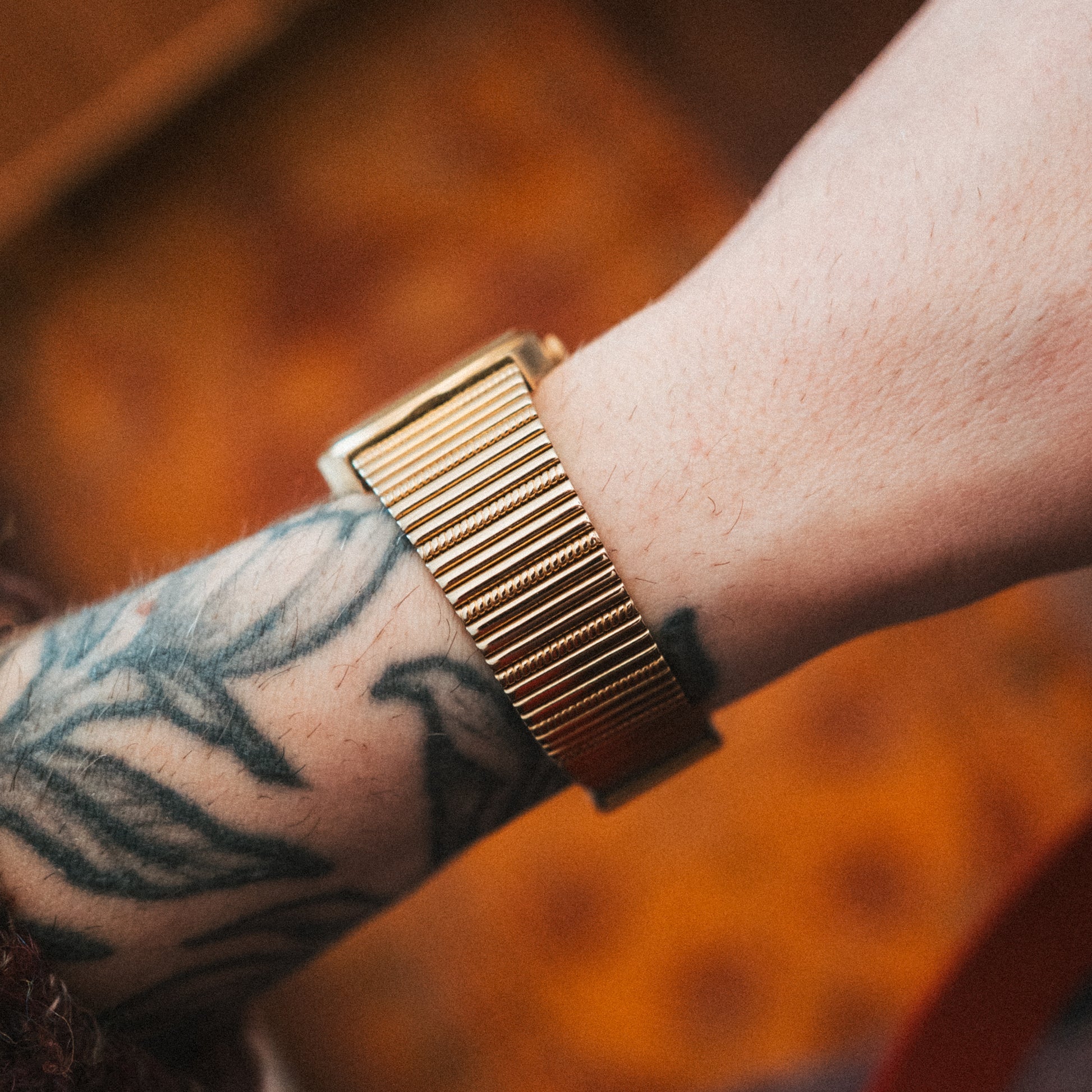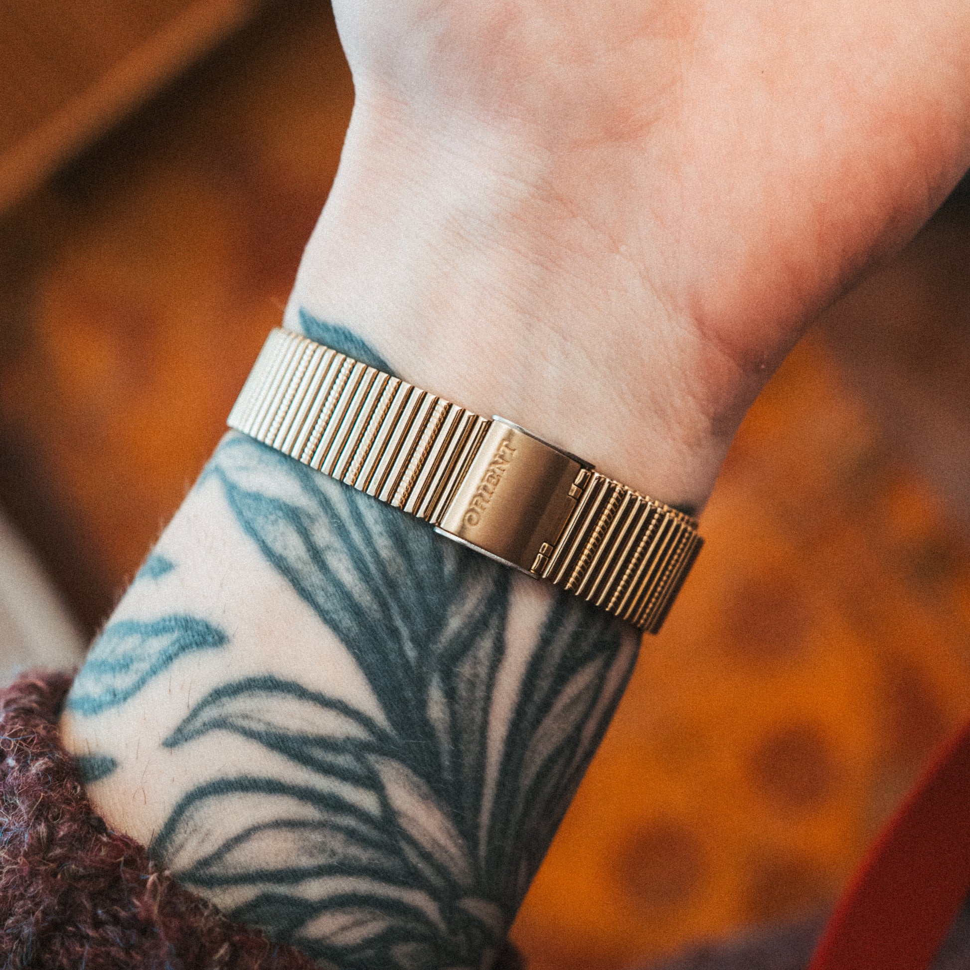 Bracelet: Original gold-tone expansion bracelet—free size design with tool-less adjustable clasp fitting most wrists, maintaining the complete factory configuration.