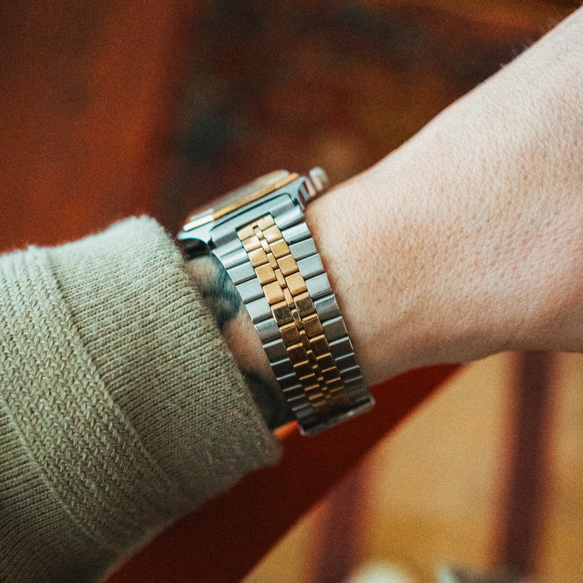 Fitted to a two-tone jubilee bracelet with alternating brushed steel and polished gold-tone center links, this piece wears comfortably with tool-less micro-adjustment capability for a perfect fit on any wrist size.
