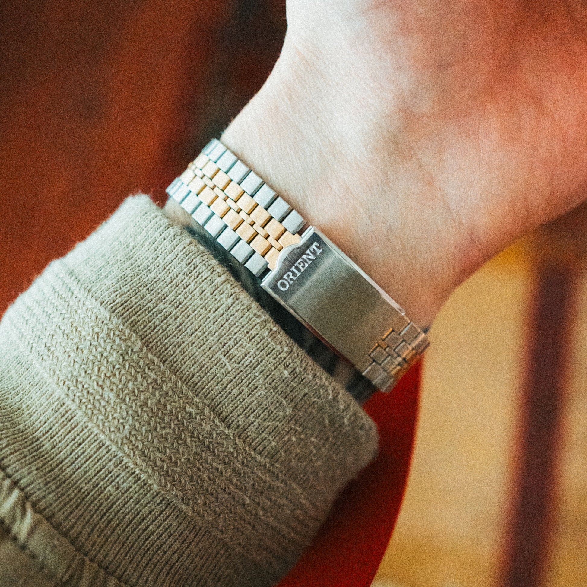 A quintessential expression of 1980s quartz design, this Orient Swimmer 100 pairs a distinctive octagonal gold-tone bezel with a crisp ivory dial and two-tone jubilee bracelet. The case features a brushed stainless steel body with polished gold-tone accents, creating a refined contrast that defined the era's aesthetic.