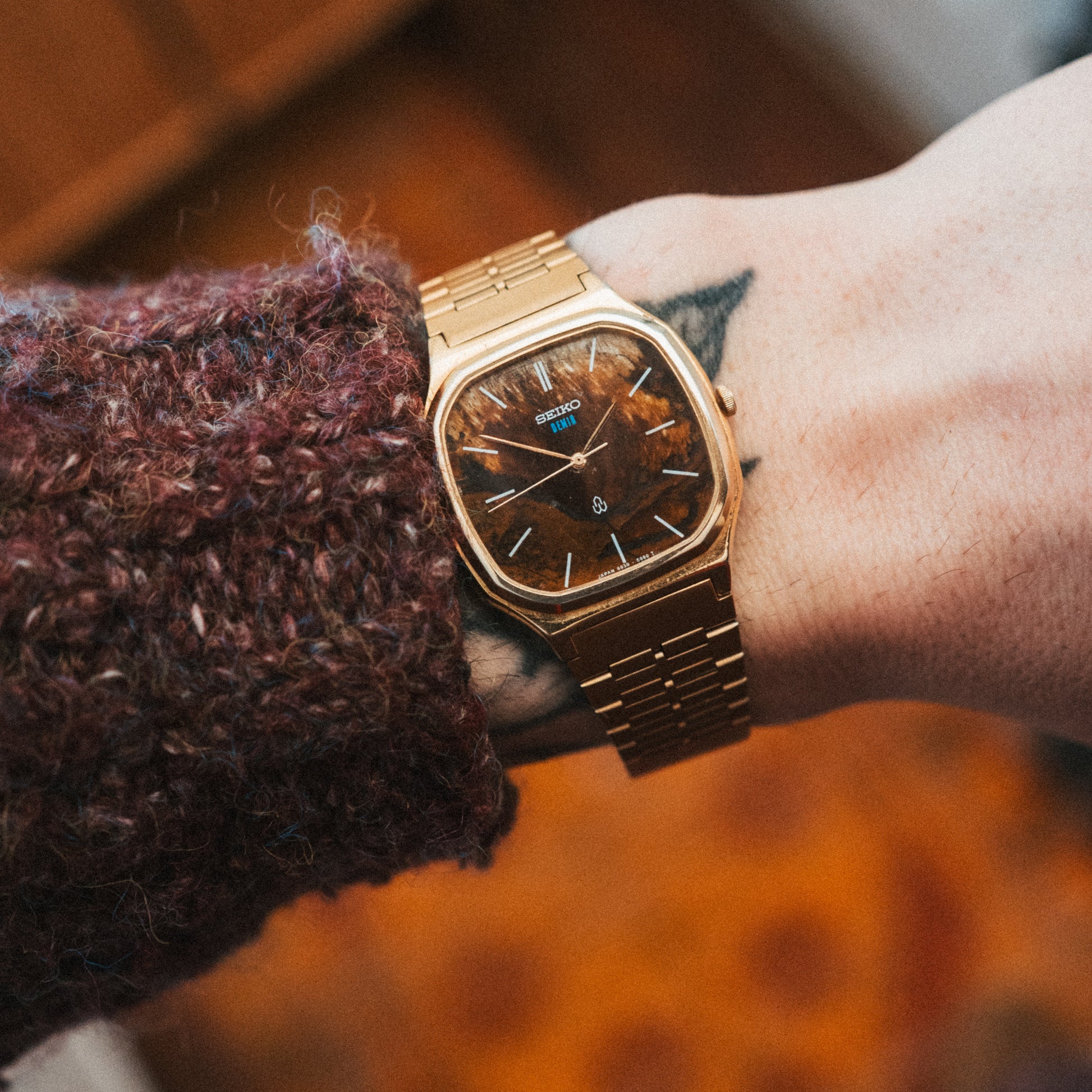 A one-of-one neo-vintage Seiko transformed with a handmade burl wood dial—this custom piece merges classic Seiko reliability with natural artistry, featuring a rare material formed through decades of environmental stress that creates unrepeatable grain patterns.