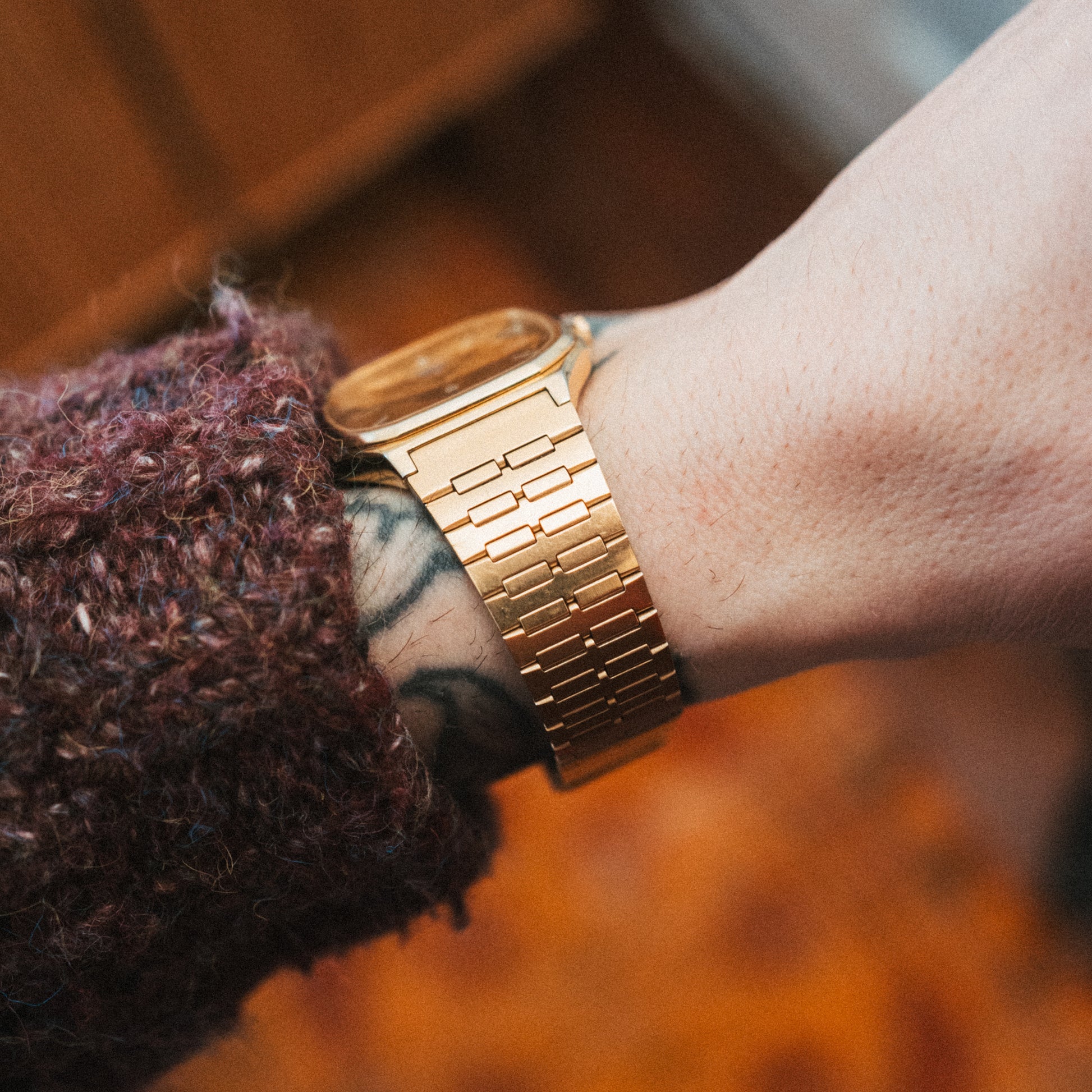 Dial: Handmade burl wood dial with rich brown tones and intricate natural grain patterns—burl wood forms when a tree undergoes stress from injury, fungus, or environmental pressure, creating dense, swirling grain patterns that have been prized by craftsmen for centuries. Each burl is unique, making this dial completely unrepeatable. Applied gold-tone indices and hands complement the warm wood tones.