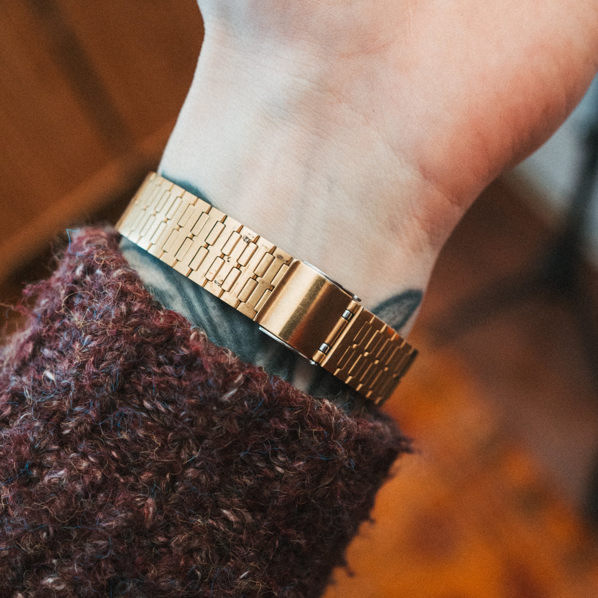 Bracelet: Gold-tone stainless steel expansion bracelet—free size design with tool-less adjustable clasp fitting most wrists.