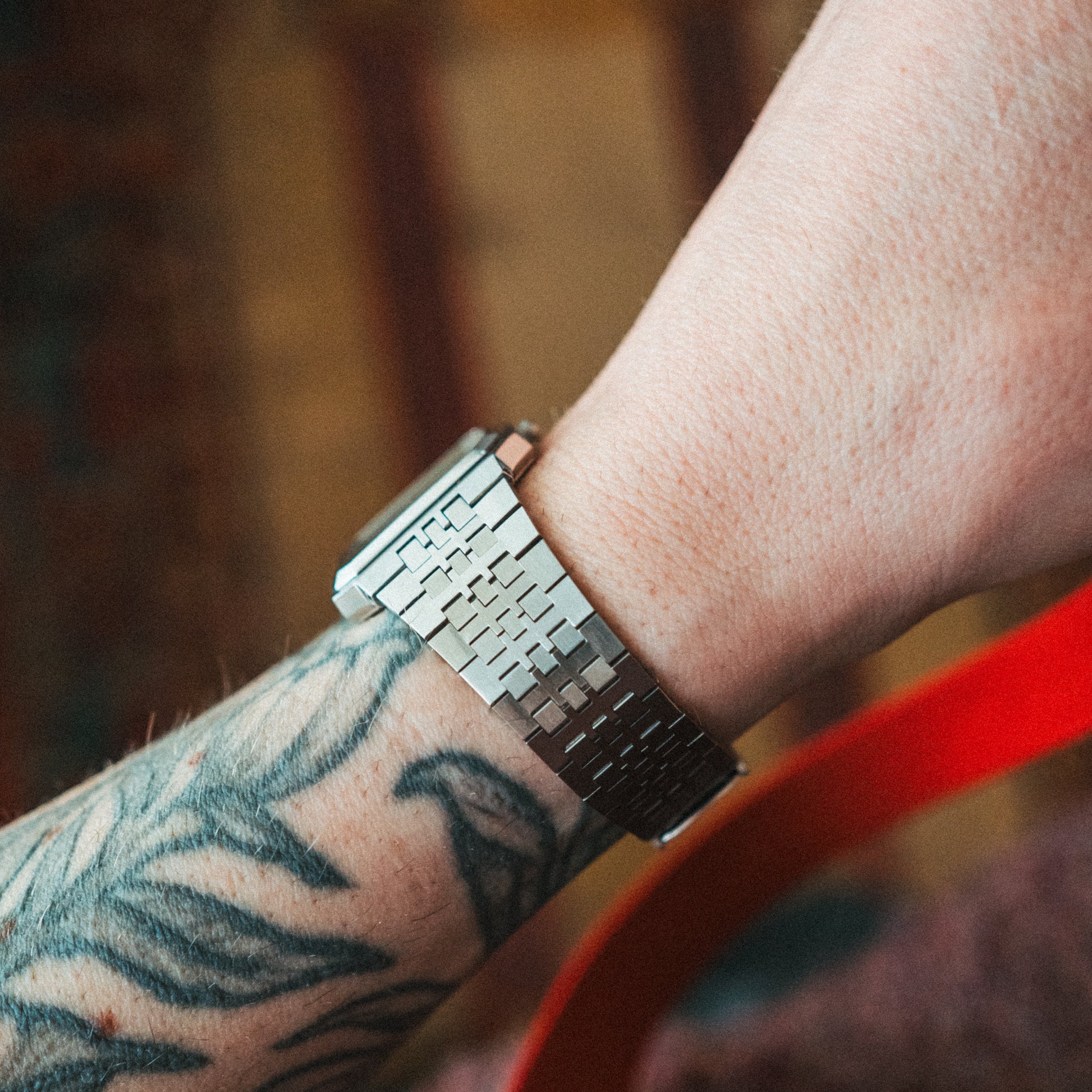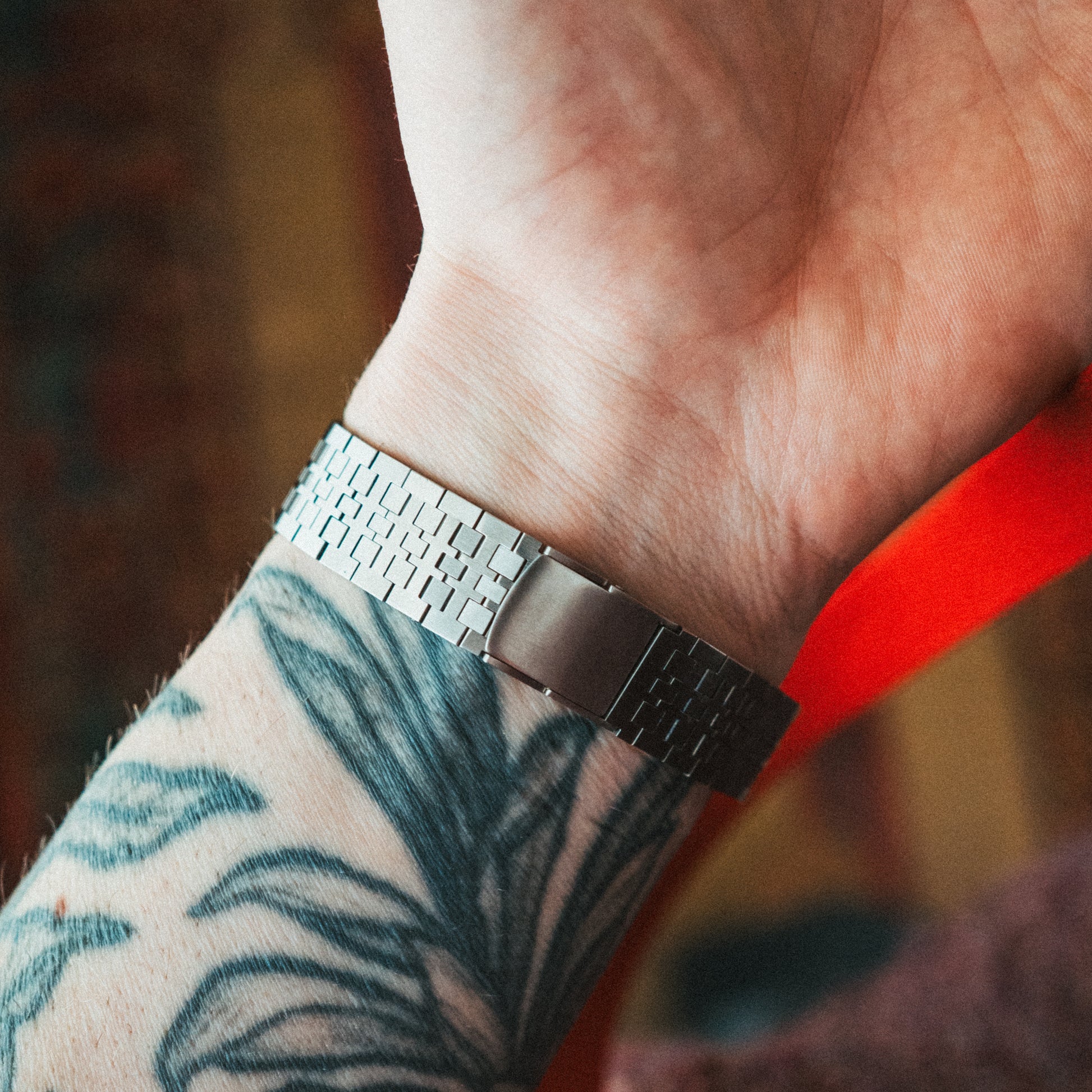 Bracelet: Integrated stainless steel bracelet with brick-link pattern, adjustable clasp comfortably fitting 17.5cm wrist or smaller.