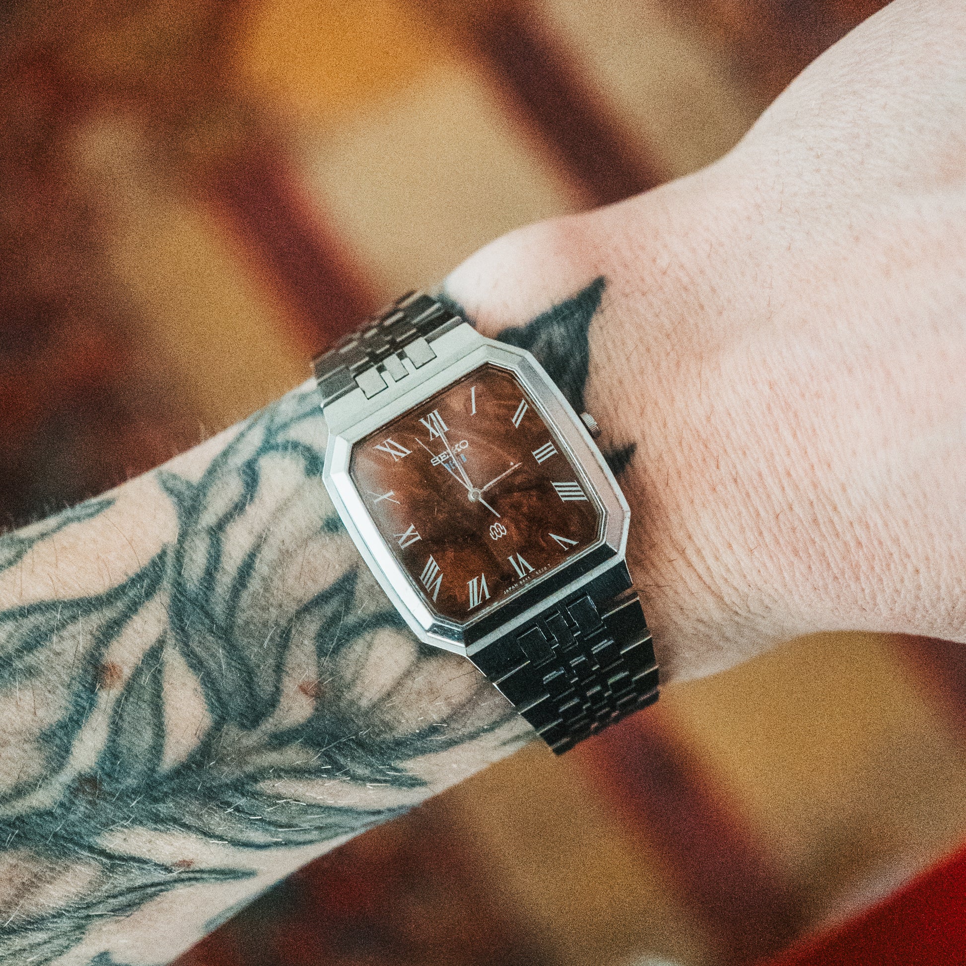 A rare case shape meets wearable art. This custom Seiko features a distinctive octagonal case from the neo-vintage era paired with a one-of-one burl wood dial—a stunning combination of architectural design and organic beauty. Each custom dial is individually crafted, making this watch truly unrepeatable.