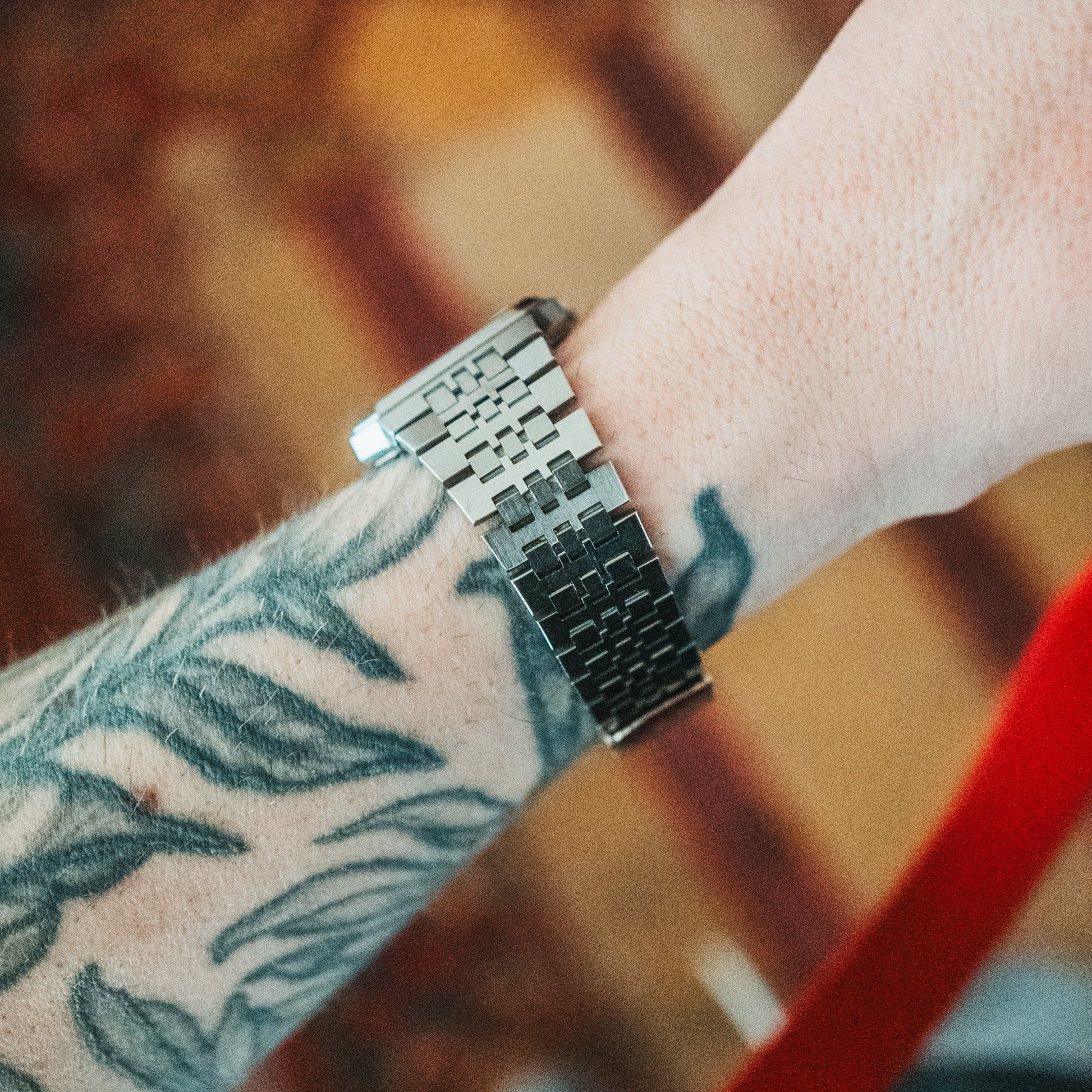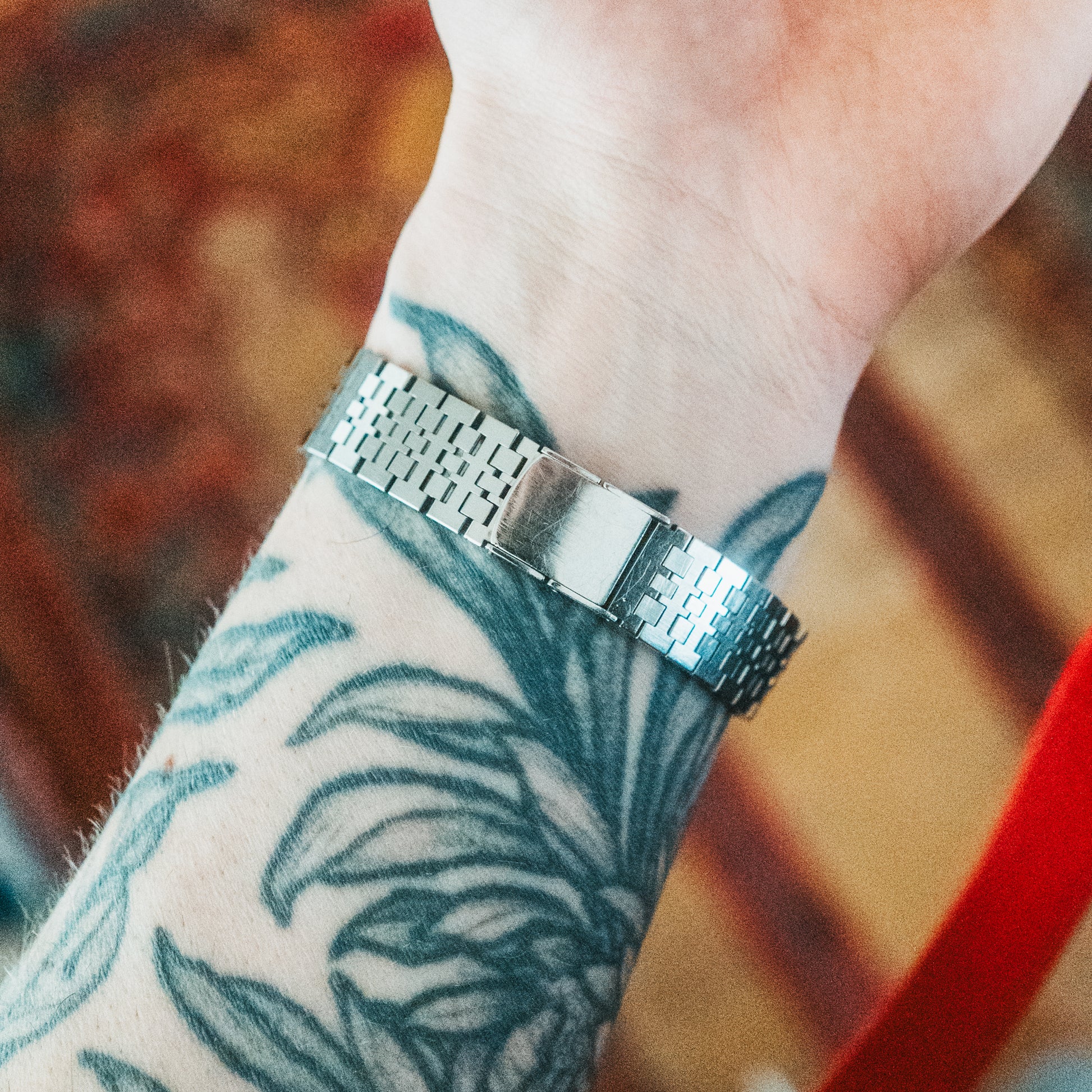 Bracelet: Integrated stainless steel beads-of-rice bracelet with a sophisticated woven texture that flows seamlessly from the case. Adjustable bracelet, comfortably fitting my 17.5cm wrist or smaller.