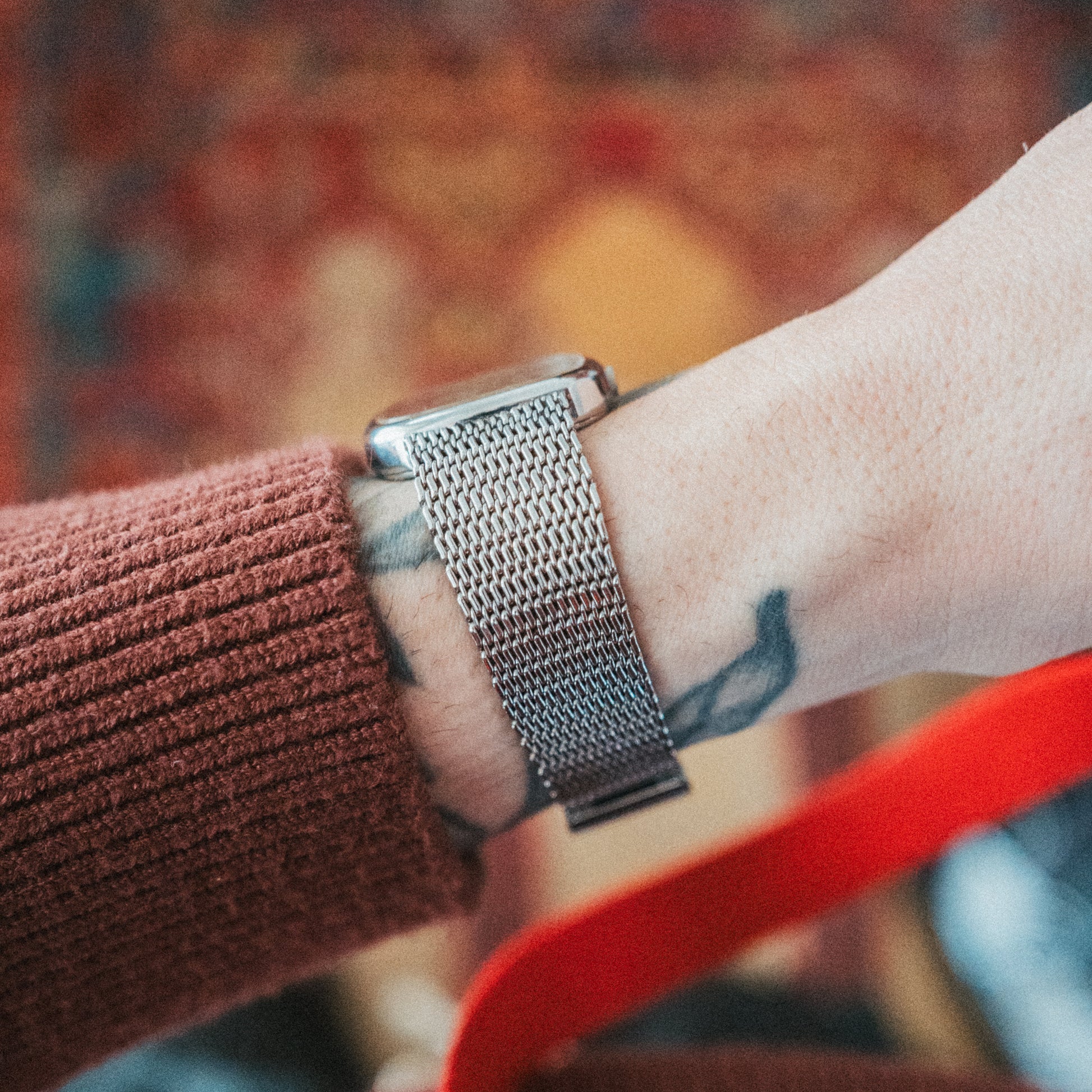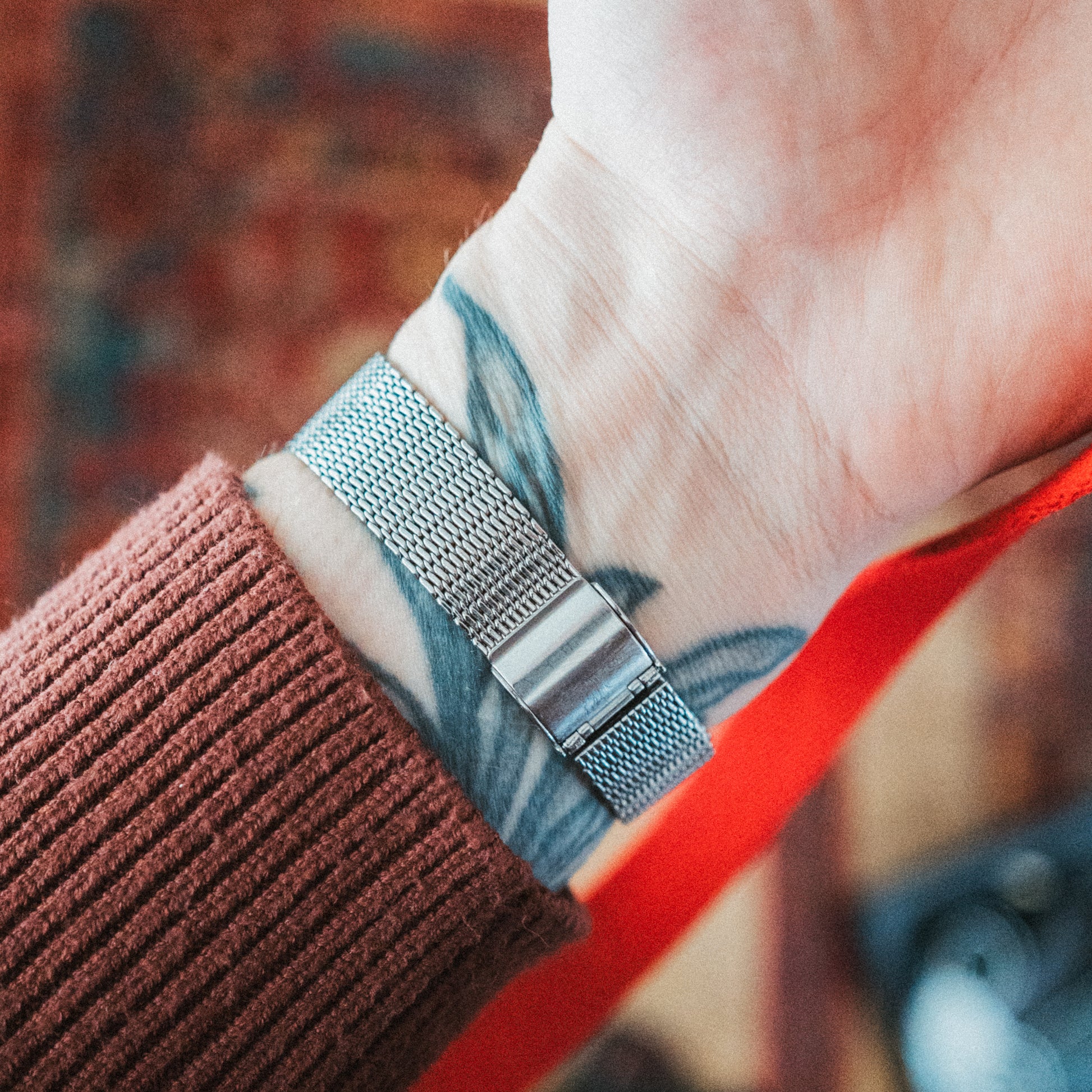 Rounded case, mesh bracelet, smooth wrist presence — simple, clean, and built to let the stone speak.