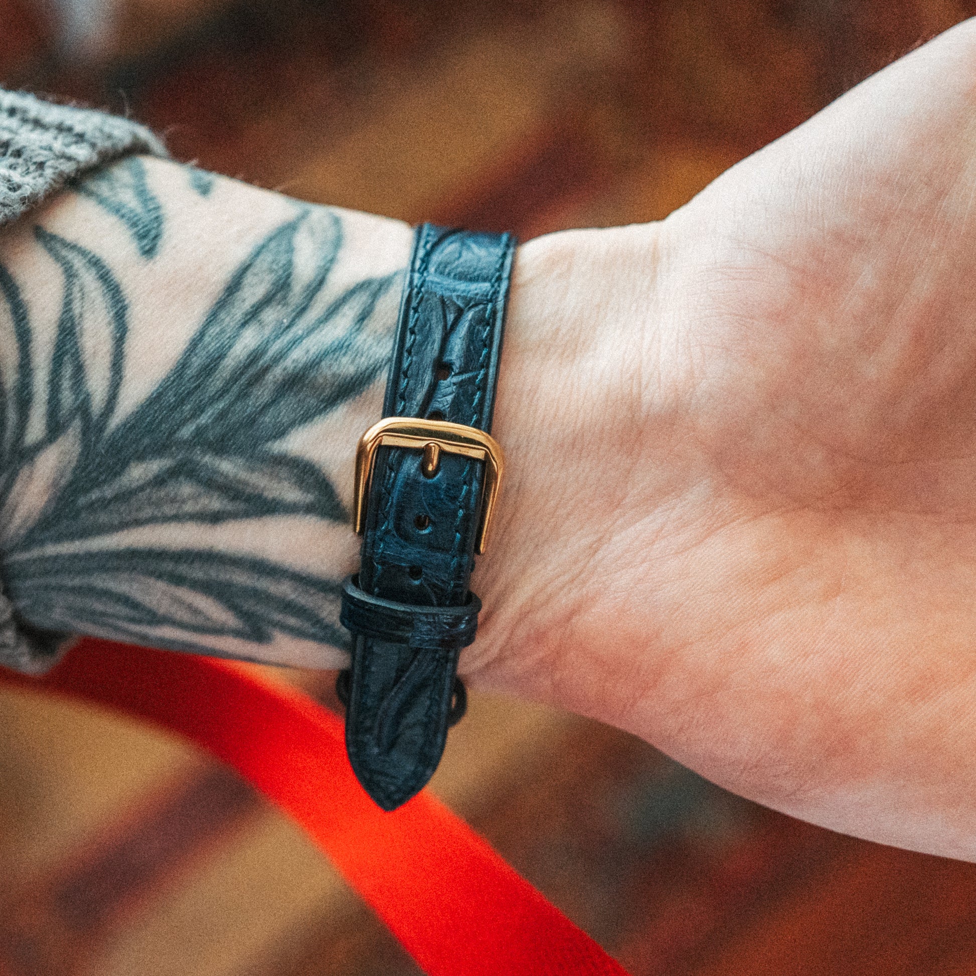 Strap: Deep blue crocodile-embossed leather strap with gold-tone buckle, adding a premium touch and sophisticated color contrast. Adjustable strap, comfortably fitting my 17.5cm wrist or smaller.