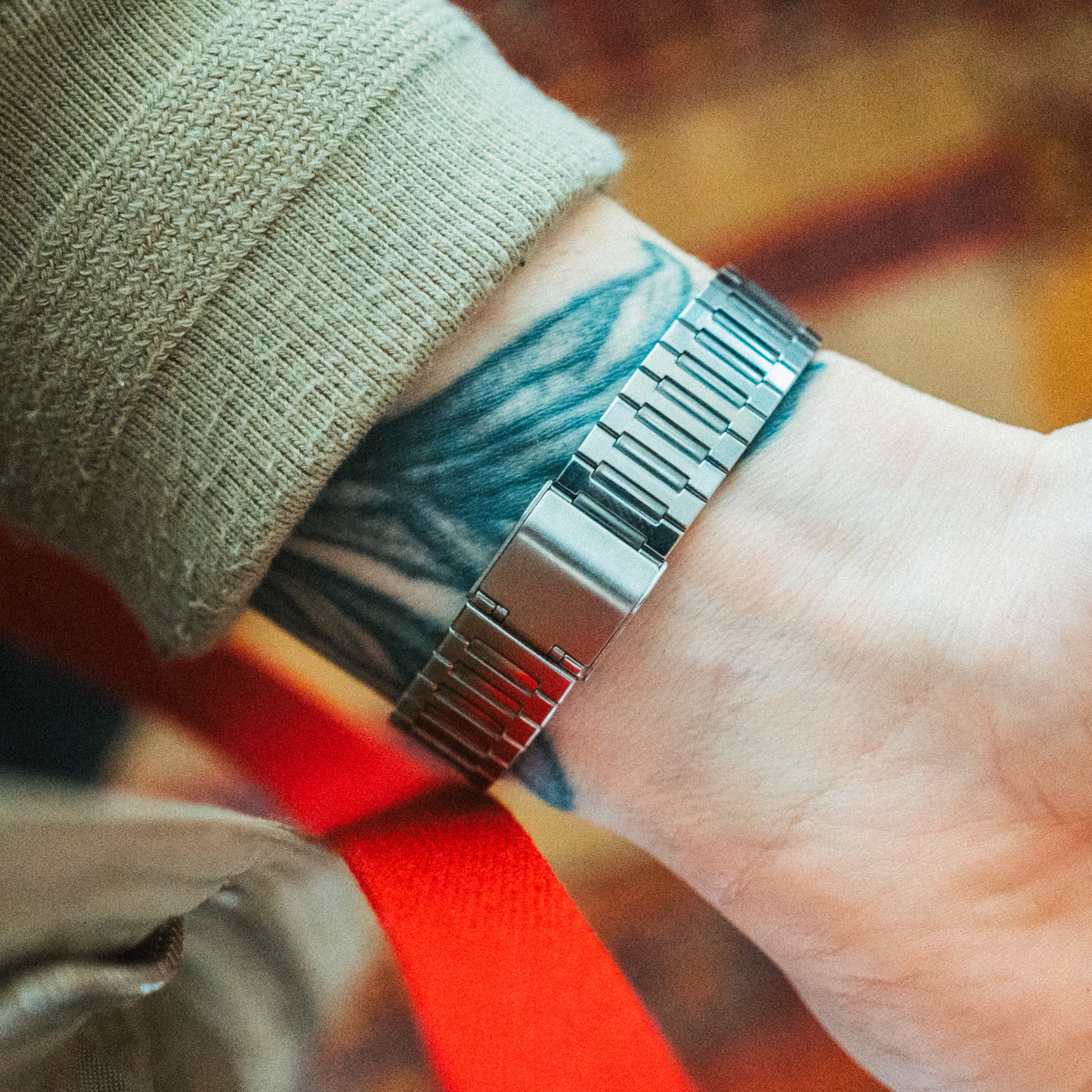 A refined example of 1980s Japanese watchmaking, this Seiko Galaxy combines the soft geometry of a cushion case with the warm contrast of two-tone finishing. The ivory dial with applied gold markers and date window creates a clean, legible face, while the integrated bracelet flows seamlessly from case to wrist in polished stainless steel.
