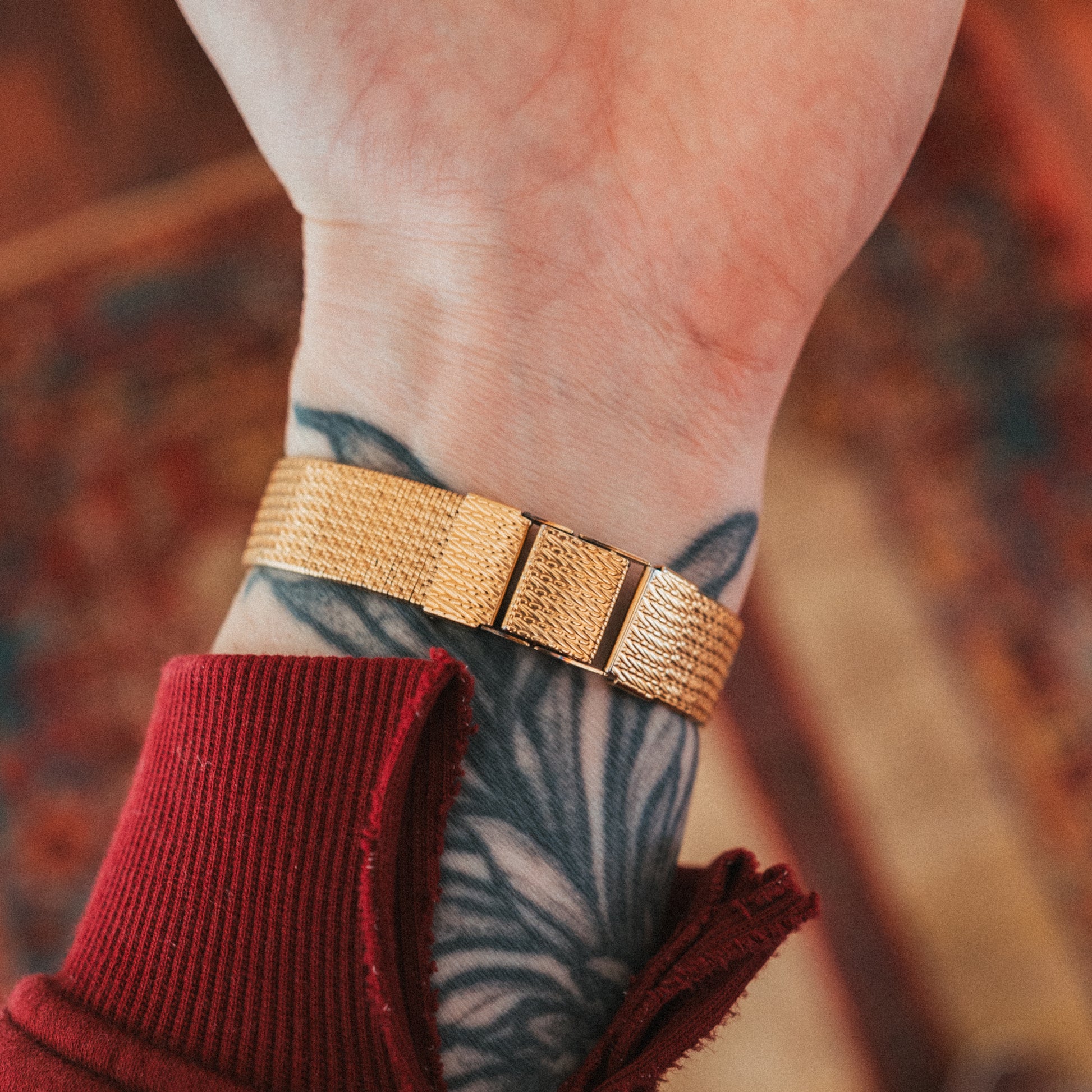 The woven gold-tone bracelet gives it a warm, dressy feel and makes it an easy daily wear.