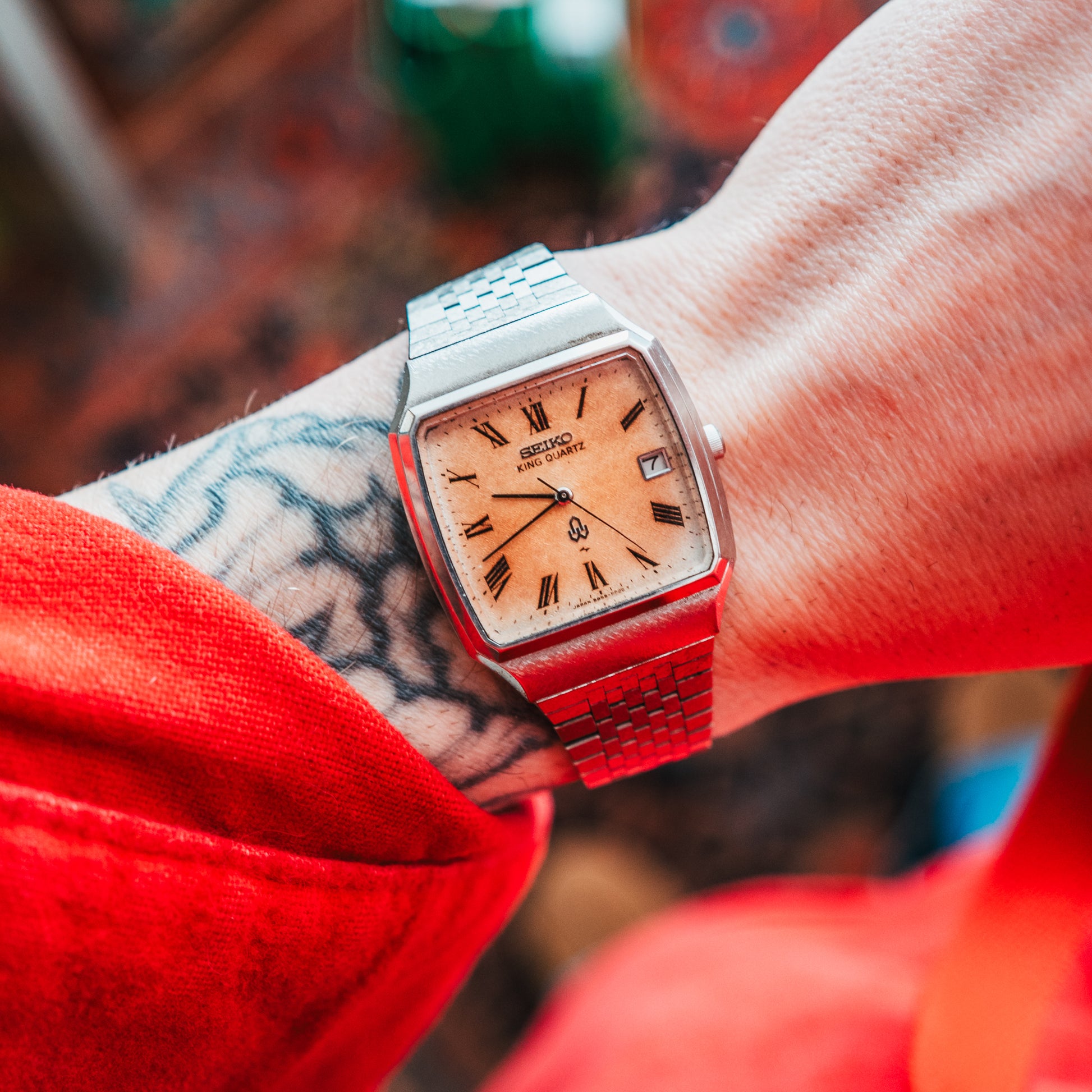 This rare neo-vintage Seiko King Quartz showcases a stunning tropic dial with natural patina—what I call a "marshmallow dial" for its soft, warm tones. The square stainless steel case features clean lines and a polished finish, while the original mesh bracelet includes a free-size adjustable clasp with a tool-less mechanism fitting most wrists. Rare to find in this condition, the King Quartz line represents Seiko's premium quartz era, and this particular dial patina is highly sought after by neo-vintage collectors.