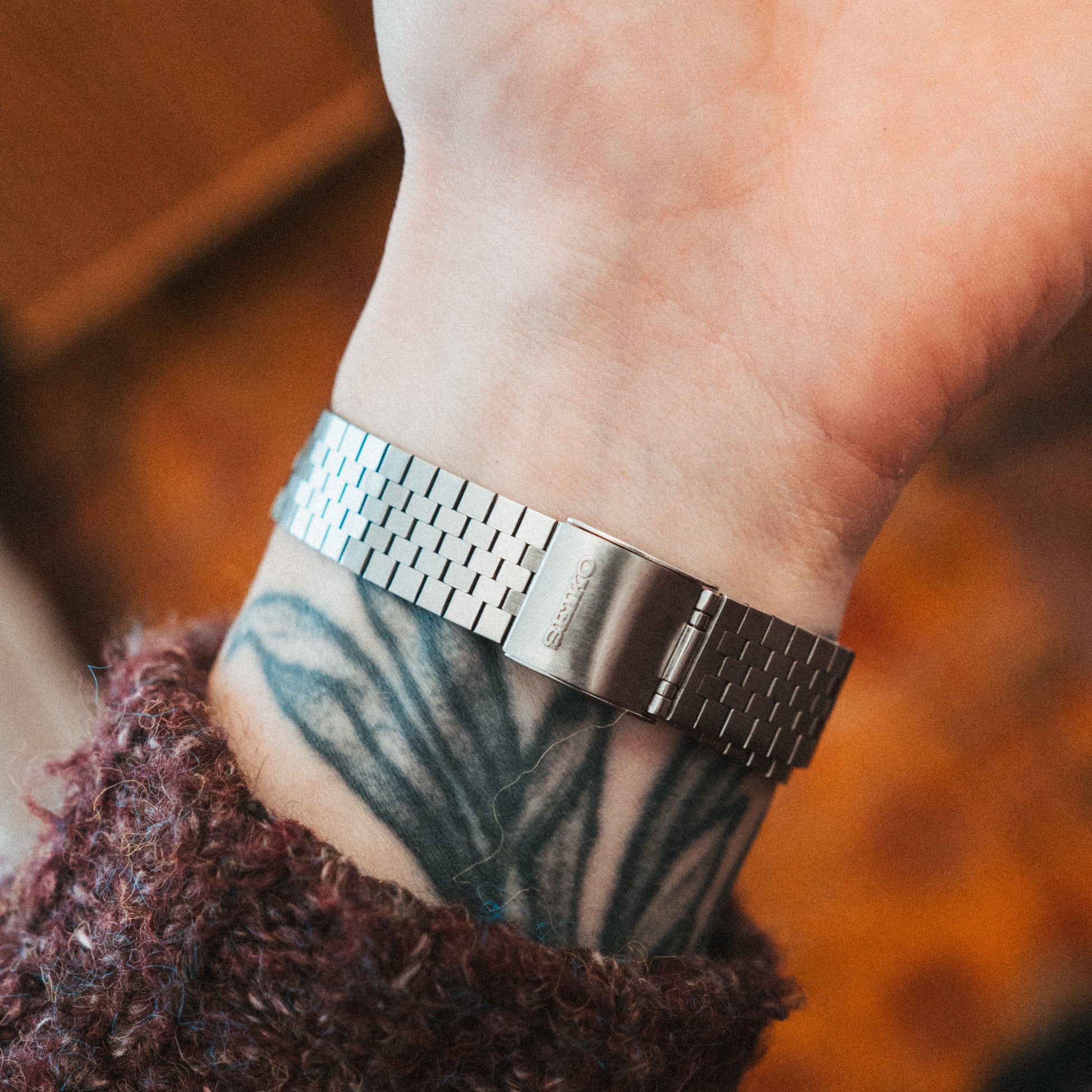 The original mesh bracelet and clasp remain intact, a rare find that completes the authentic Lord Quartz experience. The integrated design flows seamlessly from case to wrist with a tool-less adjustable clasp fitting most wrists comfortably.