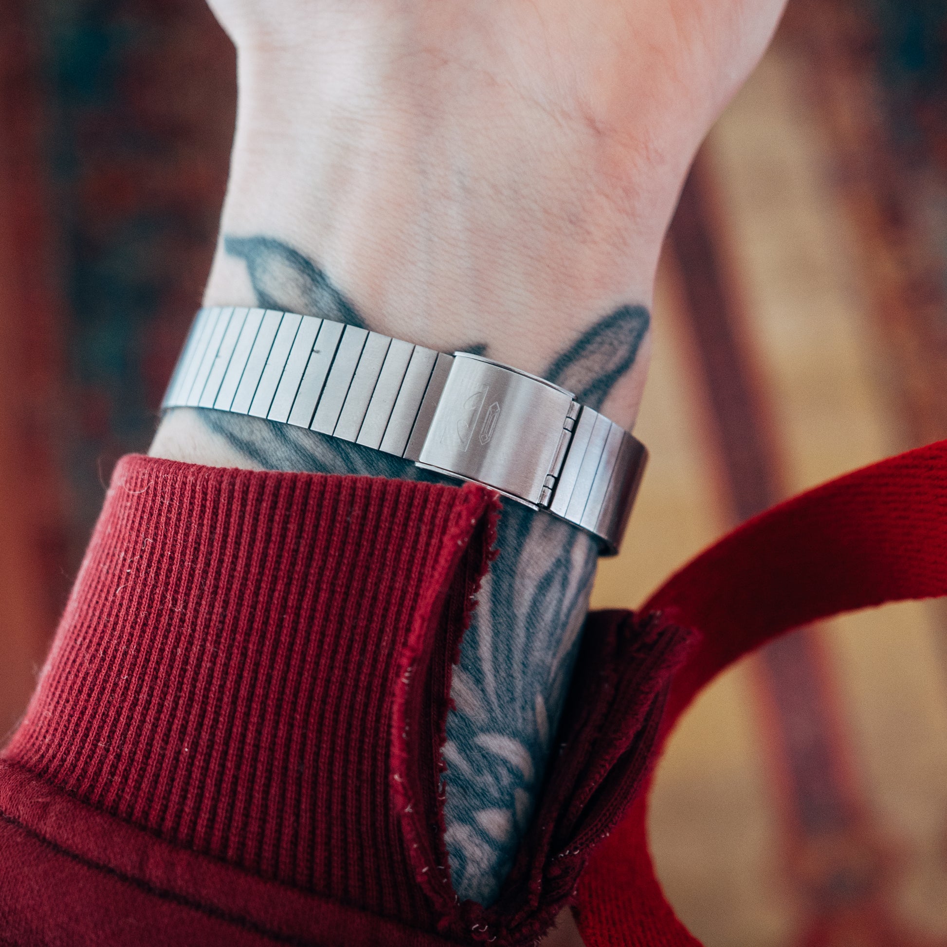 The dial features applied hour markers and a clean date window at 6 o'clock, all finished with a subtle sunburst texture that enhances the color variation. The integrated bracelet flows naturally from the case, fitted with a tool-less adjustable clasp that accommodates most wrists without additional sizing.