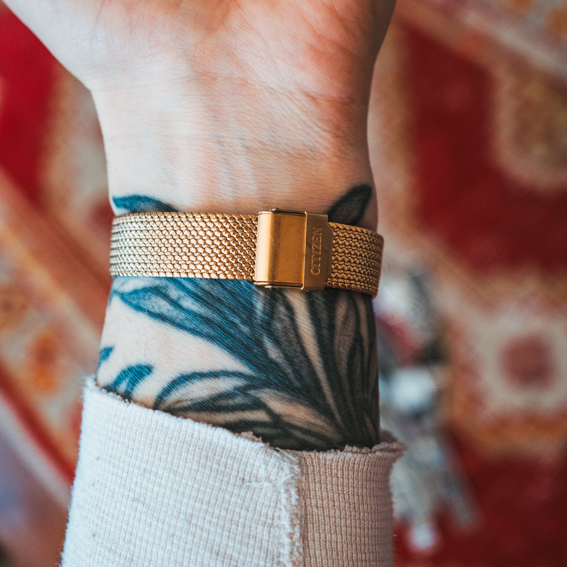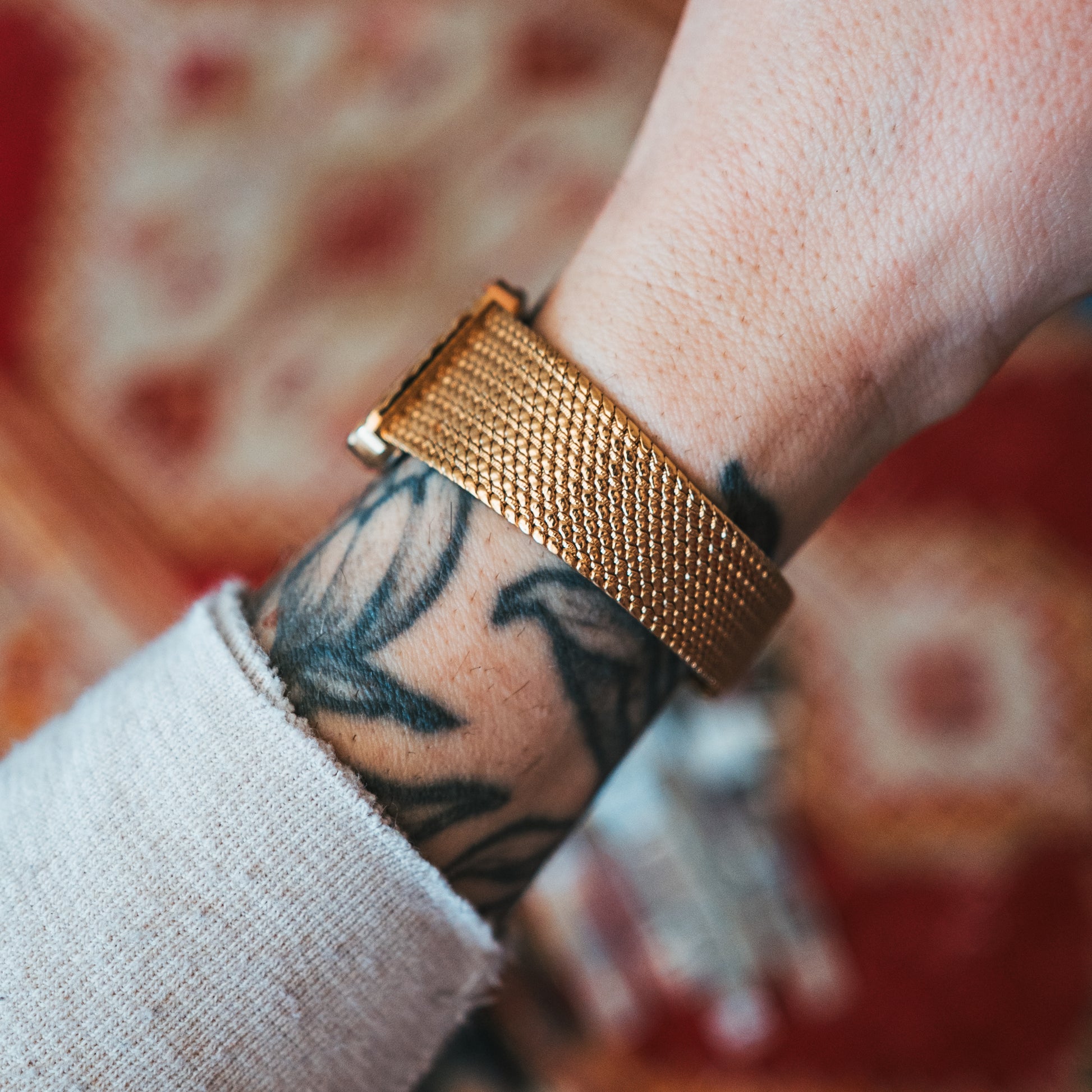 The original all-gold mesh bracelet features a tool-less adjustable clasp, fitting most wrists comfortably with easy micro-adjustments on the fly.