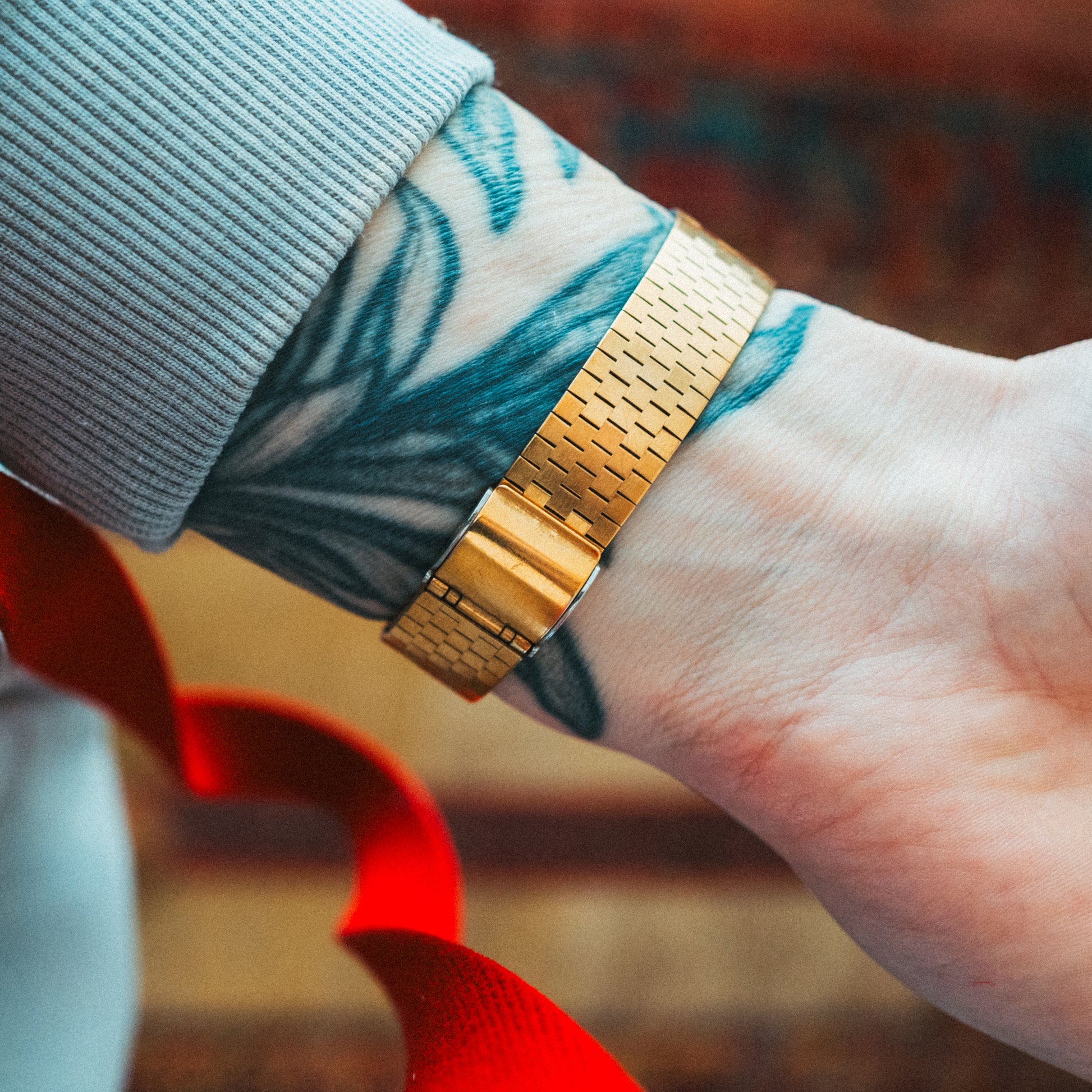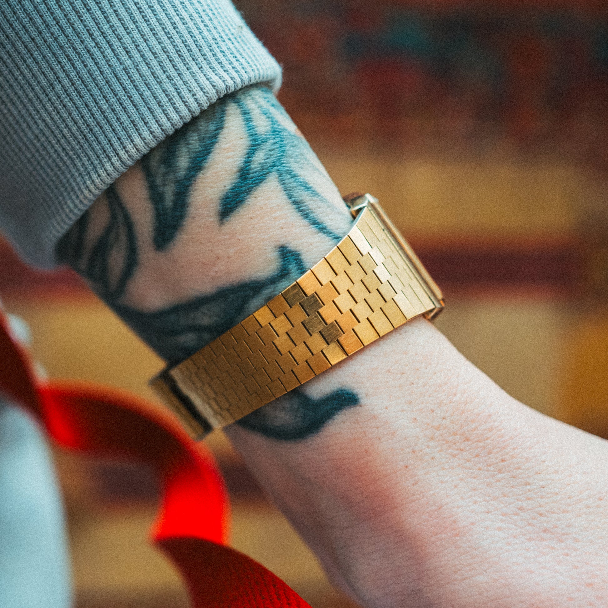 The integrated gold-tone mesh bracelet flows seamlessly from the case with a fine, woven construction that drapes elegantly around the wrist. The supple mesh provides exceptional comfort and a refined aesthetic, secured by a fold-over clasp with push-button release. This piece perfectly captures the sophisticated, design-forward spirit of its era.