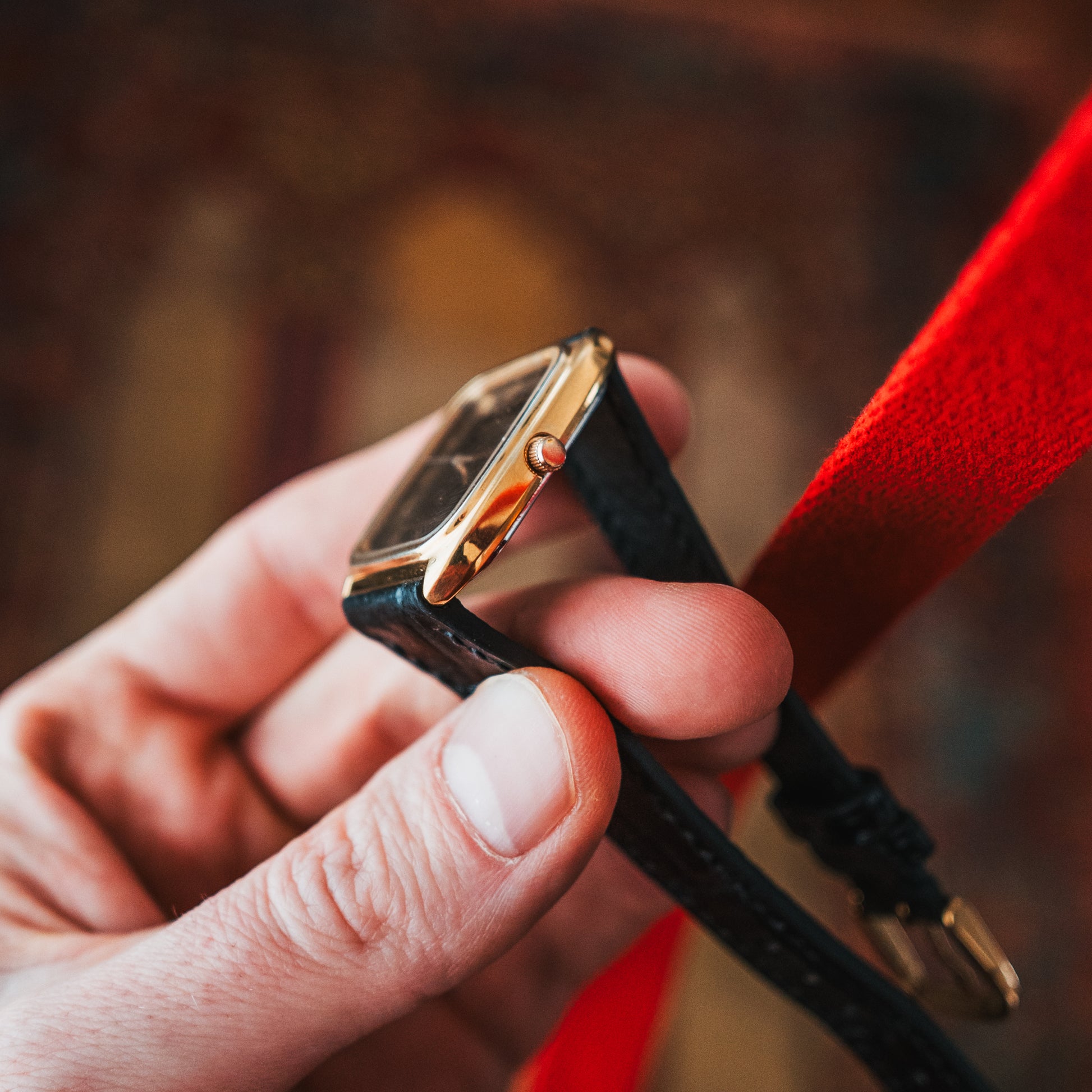Special Note: The very cool case shape with TV dial inspiration is a true standout—this distinctive design pays homage to the iconic television-shaped watches of the era, creating a unique retro-modern aesthetic. The new leather strap complements the watch's classic appeal while the piece remains in great condition.