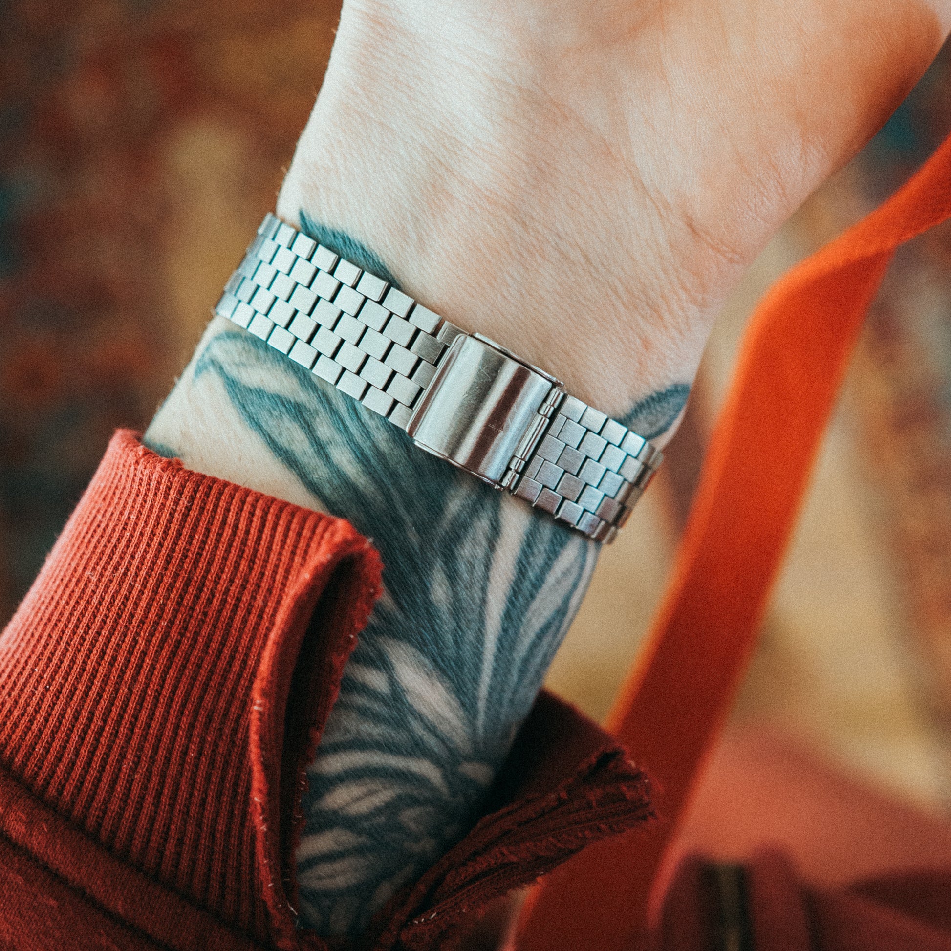 Special Note: All-matching silver jubilee-style bracelet and buckle — the five-link construction is substantial and refined, sitting flush against the wrist with a weight that feels intentional. The tonneau-shaped case frames the dragon’s blood jasper dial with clean, architectural lines. The teal Seiko logo on the dial adds a pop of color that ties the whole piece together. A true one-of-one.