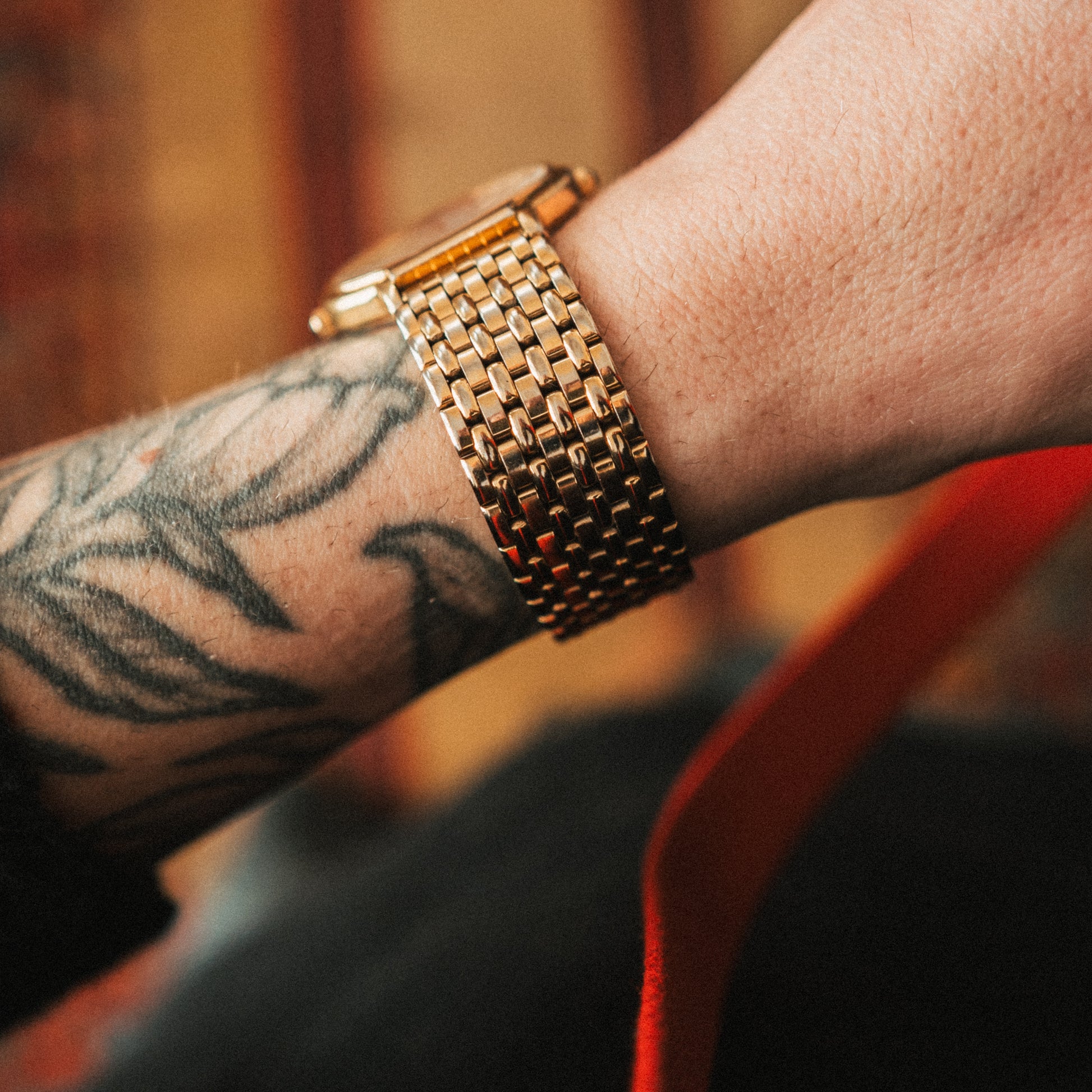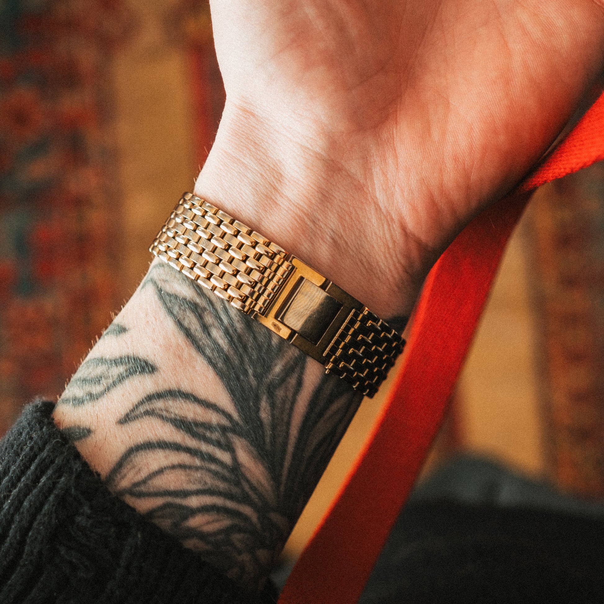 Bracelet: Matching gold-tone stainless steel beads-of-rice bracelet with polished links, offering both vintage character and contemporary wearability. Adjustable bracelet, comfortably fitting my 17.5cm wrist or smaller.