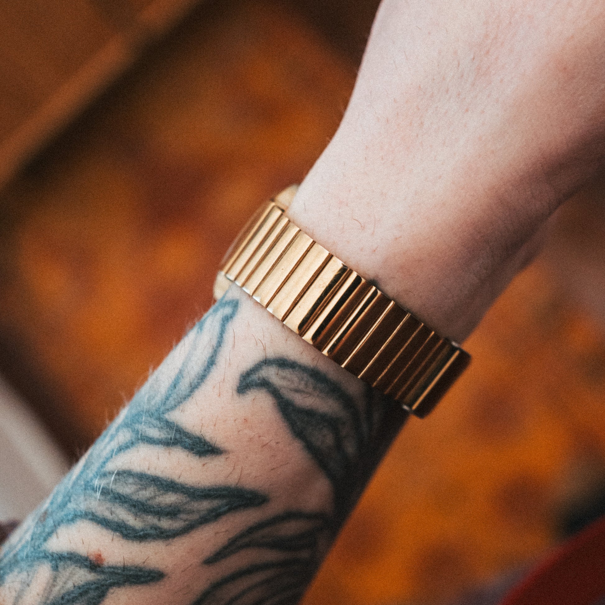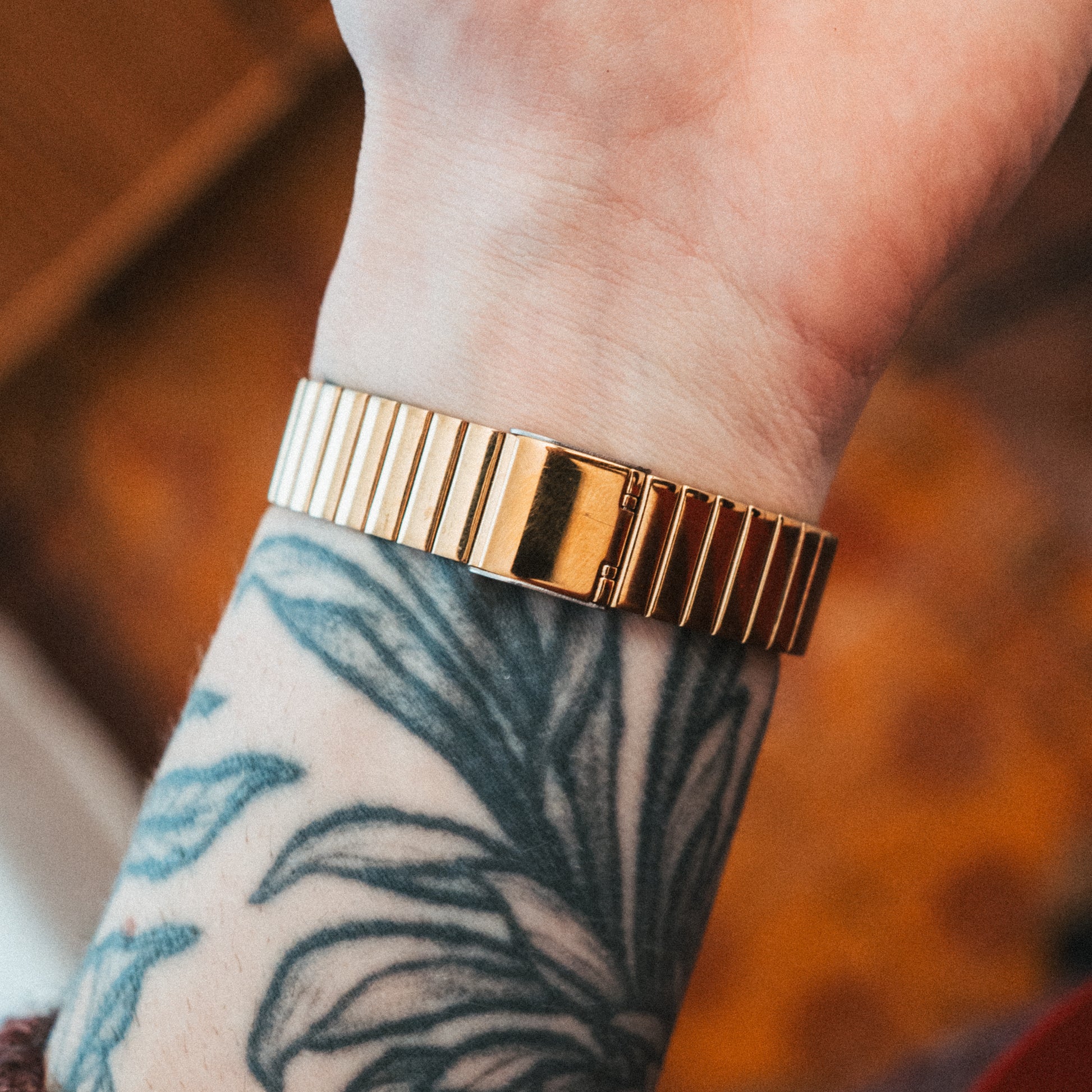 The gold-tone expansion bracelet features a tool-less adjustable clasp, fitting most wrists comfortably without additional sizing.