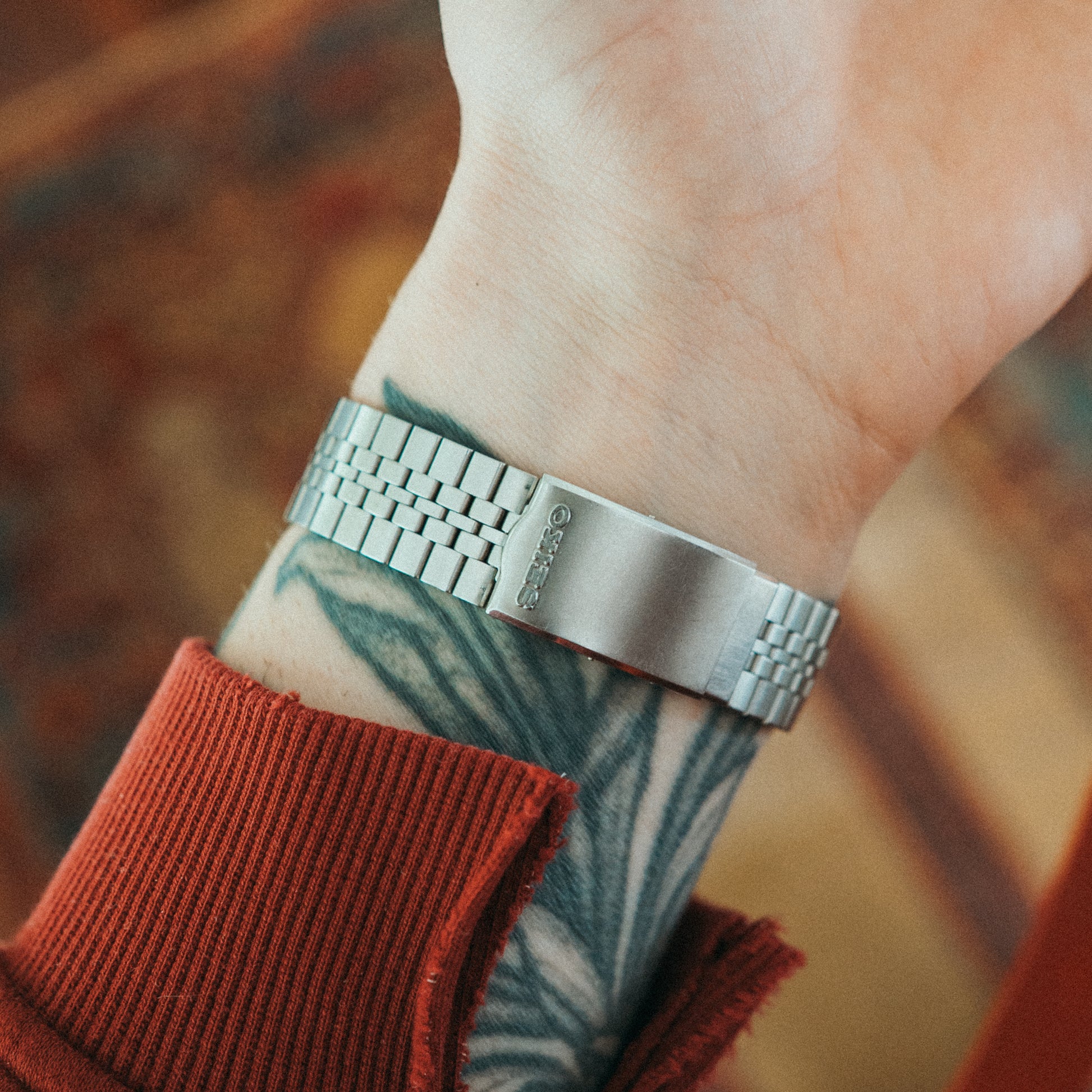 Special Note: Wearing its original Seiko bracelet — a wide five-row jubilee-style steel that drapes with weight and presence, each link brushed to a consistent satin finish that has held beautifully over the decades. The case is completely unpolished, preserving every original surface and the sharp geometry of the stepped lugs. The white dial is immaculate — slim applied baton indices, a day-date window at 3 o'clock displaying both day and date, and the Type II designation printed below the Seiko logo in a font that feels completely of its era. Very clean, very collectible, and increasingly hard to find in this condition.