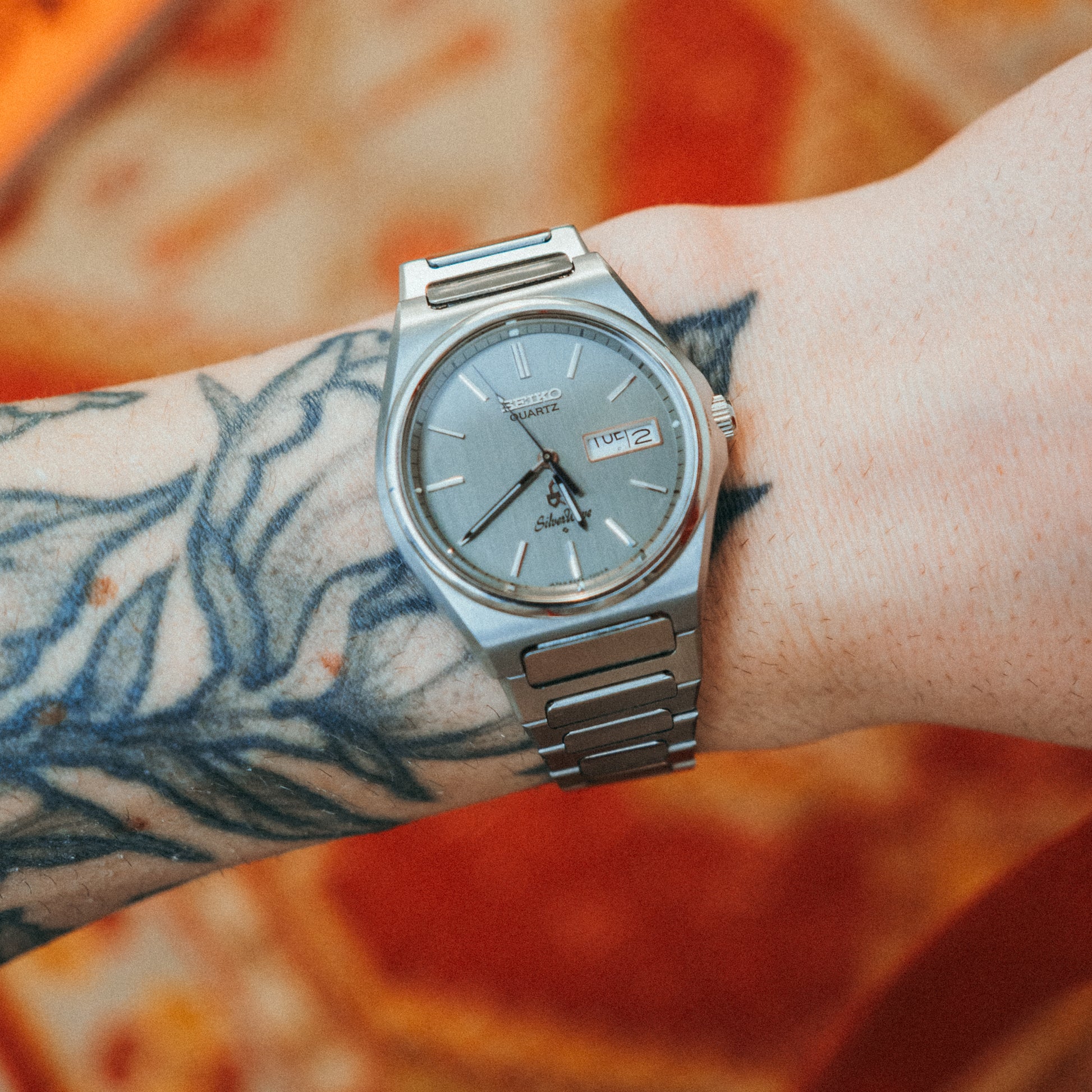 A refined expression of 1980s minimalism, this Seiko Silverwave captures the decade's shift toward understated elegance. The polished stainless steel case features clean, flowing lines that give the watch its name, while the integrated bracelet creates a seamless visual flow from case to wrist.