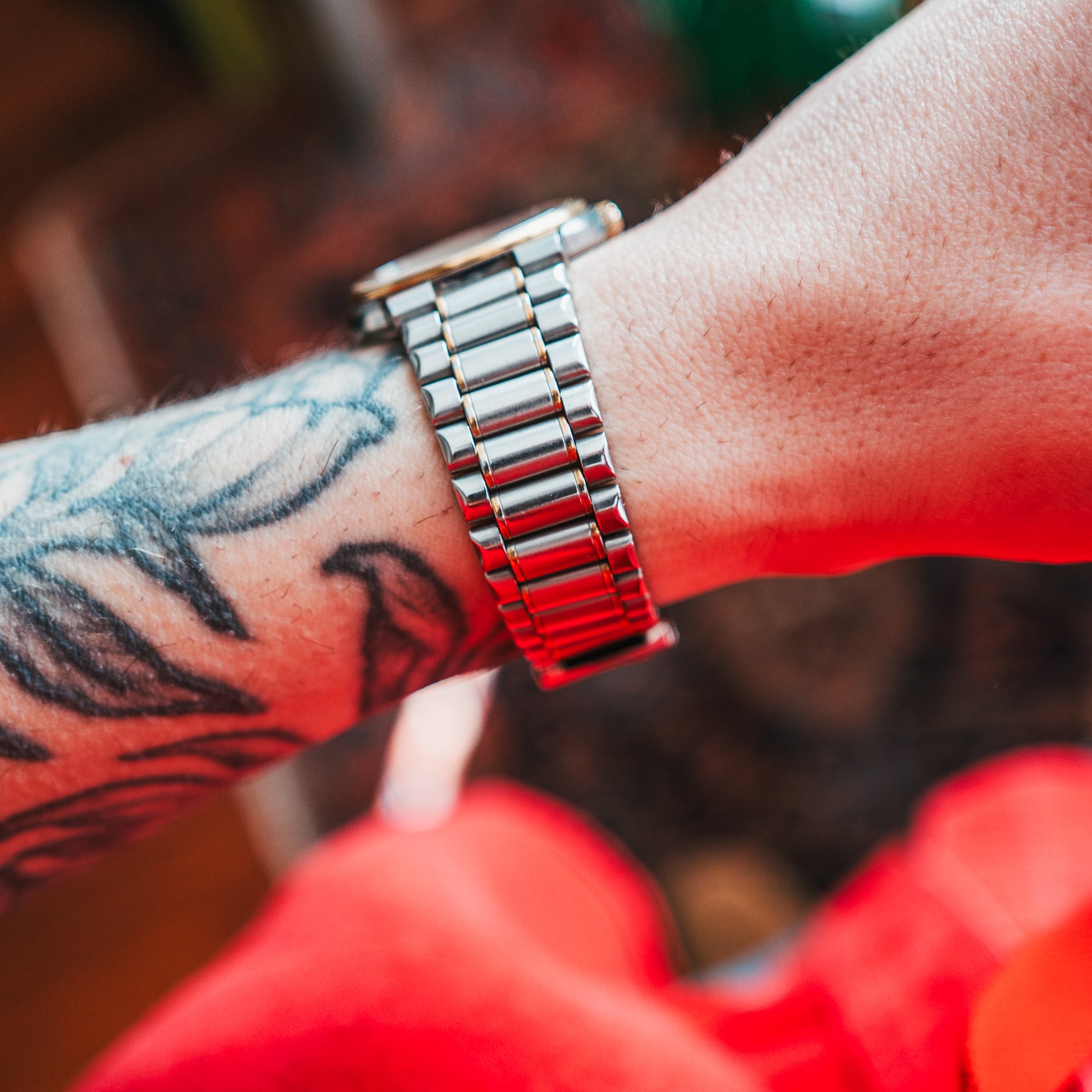 This neo-vintage Seiko Spirit captures the refined elegance of late 20th-century Japanese watchmaking. The stainless steel case features a polished finish with rose gold accents, while the clean white dial displays classic Roman numerals and a subtle date window. The original stainless steel bracelet—rare to find in this condition—features a tool-less adjustable clasp fitting most wrists comfortably. A very cool design that remains highly sought after among neo-vintage collectors.