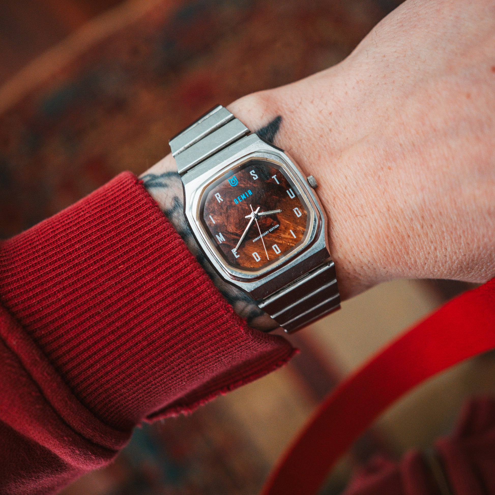 A neo-vintage watch paired with a custom handmade burl wood dial. Each dial is handmade and one of one — wearable art.