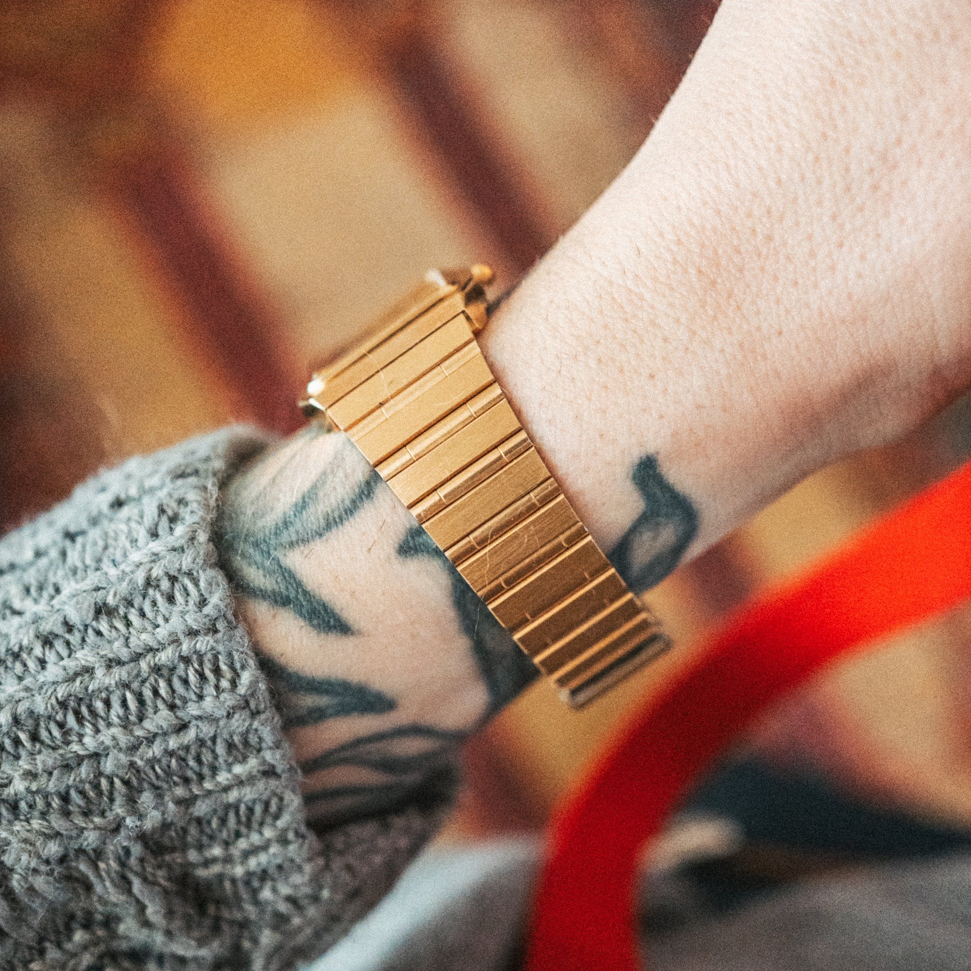Case: Gold-tone stainless steel with an integrated bracelet design inspired by luxury sports watch aesthetics, featuring a distinctive rectangular profile.