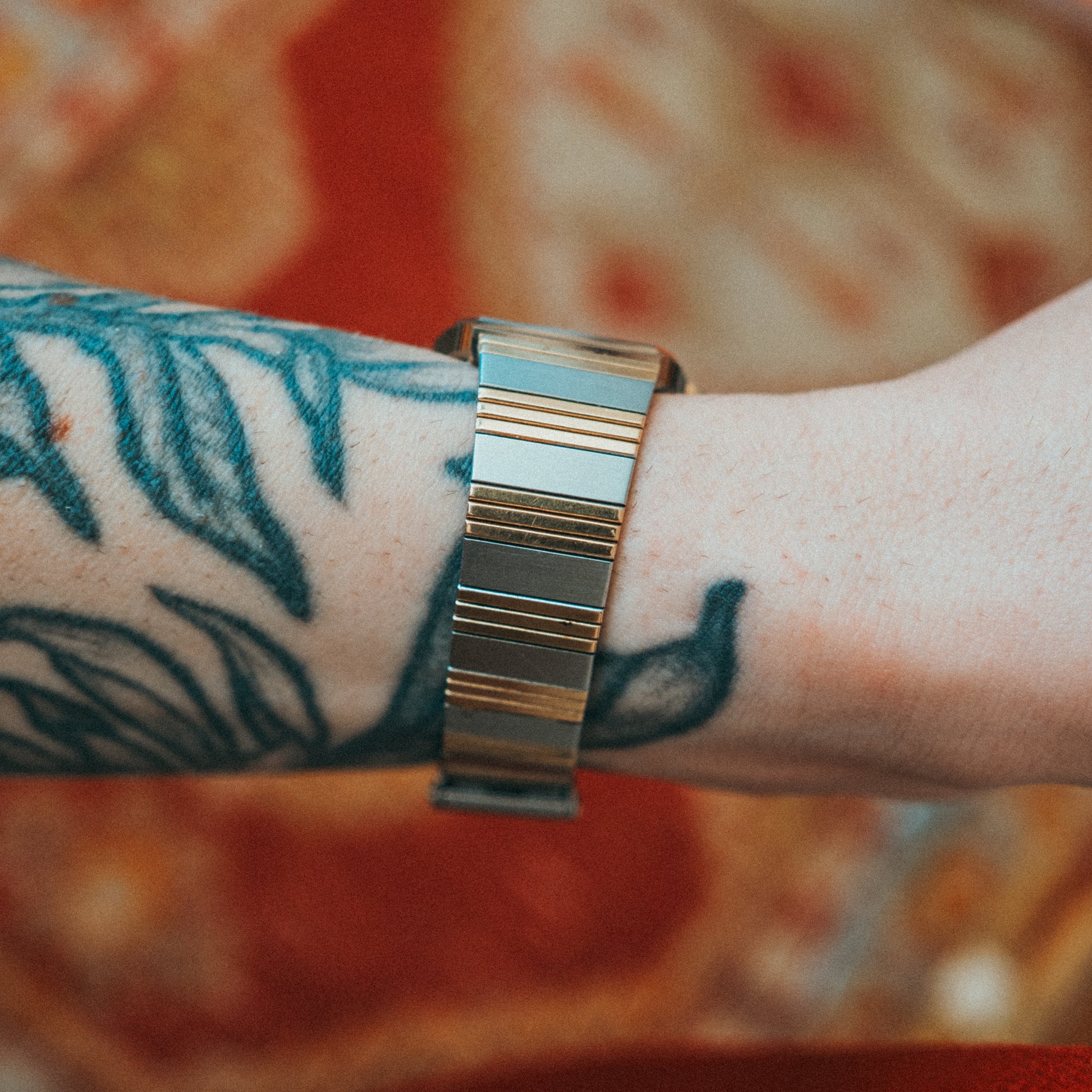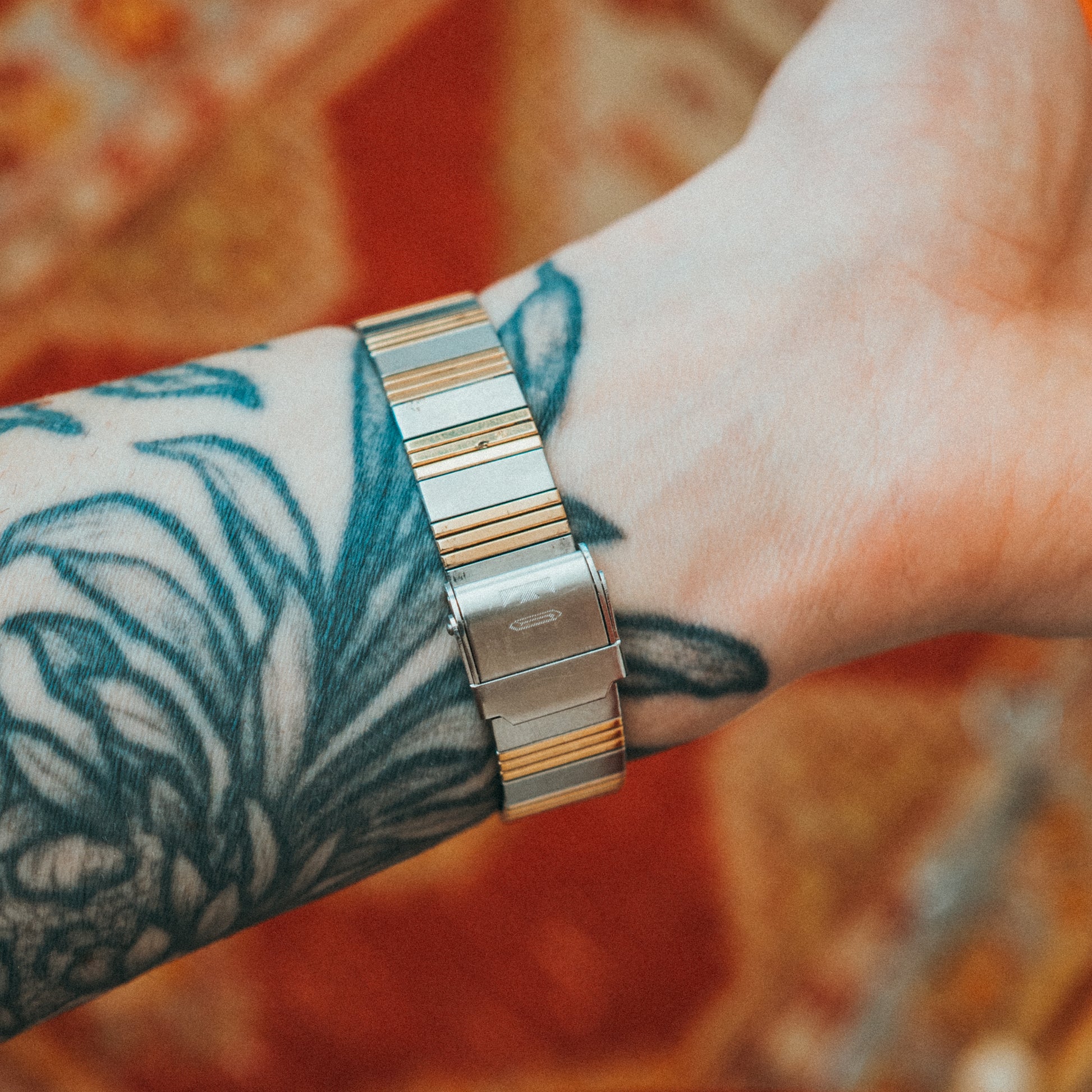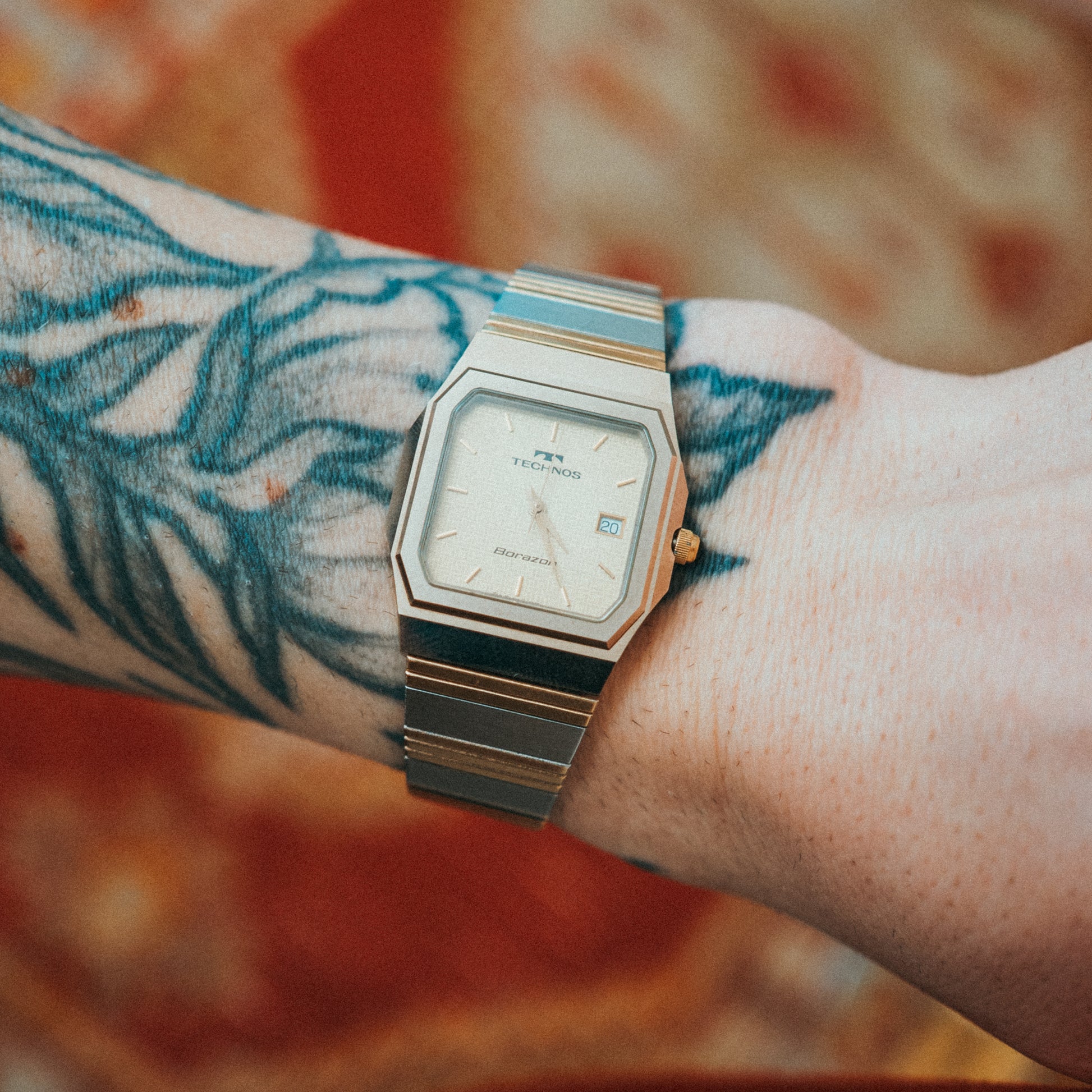 A striking example of 1980s design innovation, this Technos Borazon showcases the era's bold experimentation with two-tone finishes and geometric forms. The stainless steel case features distinctive gold-tone accents that create visual rhythm across the integrated bracelet design, embodying the decade's confident aesthetic.