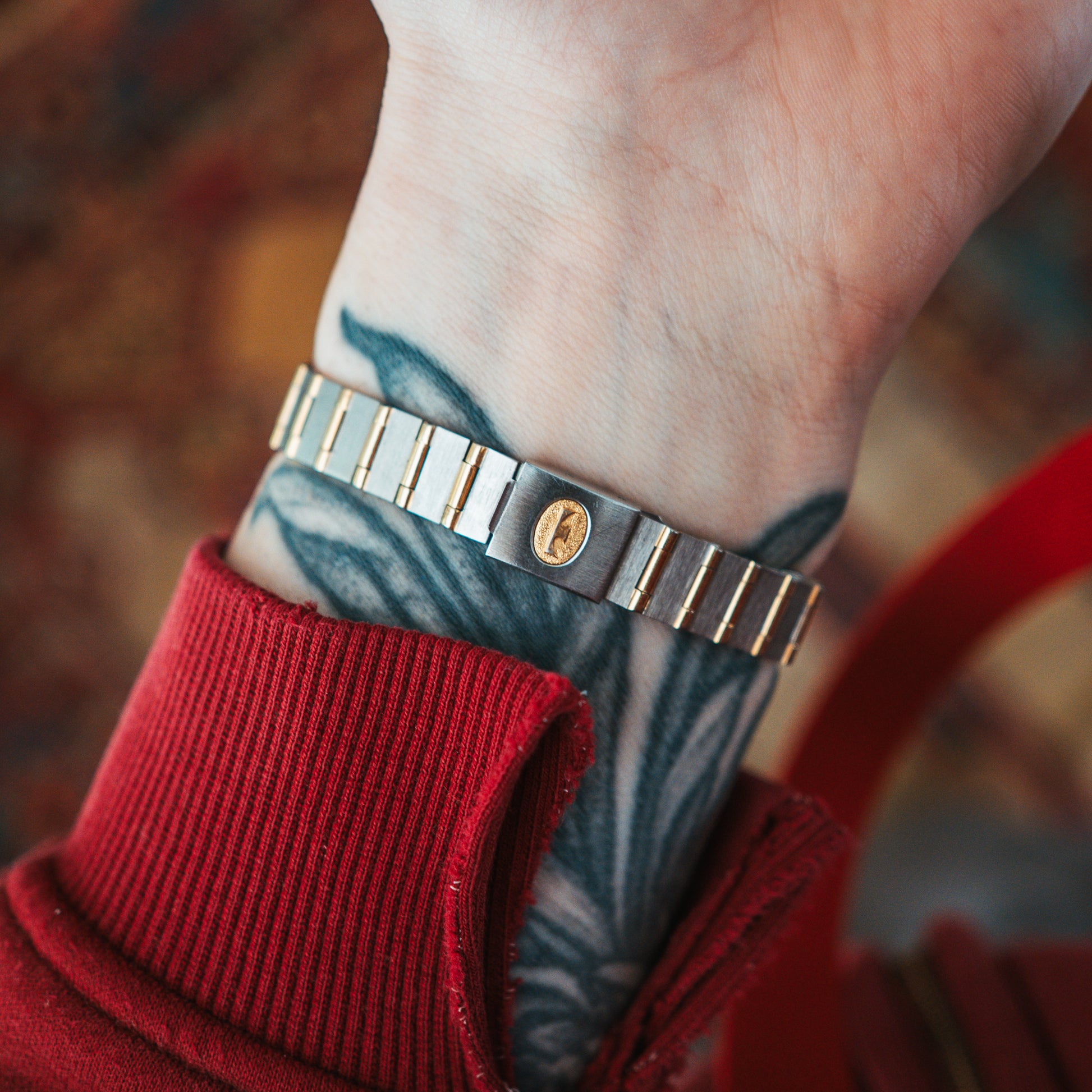 Special Note: This is a rare find. The Cortina name carries weight — Technos was a respected Swiss house, and this piece shows why. The dial is cream-white with bold black Roman numerals, a gold inner chapter ring, and vivid teal sword hands that cut across the face with precision. The round case is framed in gold with exposed screws at the bezel — a Santos-inspired detail that gives it an architectural edge. The two-tone integrated bracelet runs silver links with gold rails, and the clasp on the reverse bears a gold oval medallion. Understated from a distance, detailed up close.