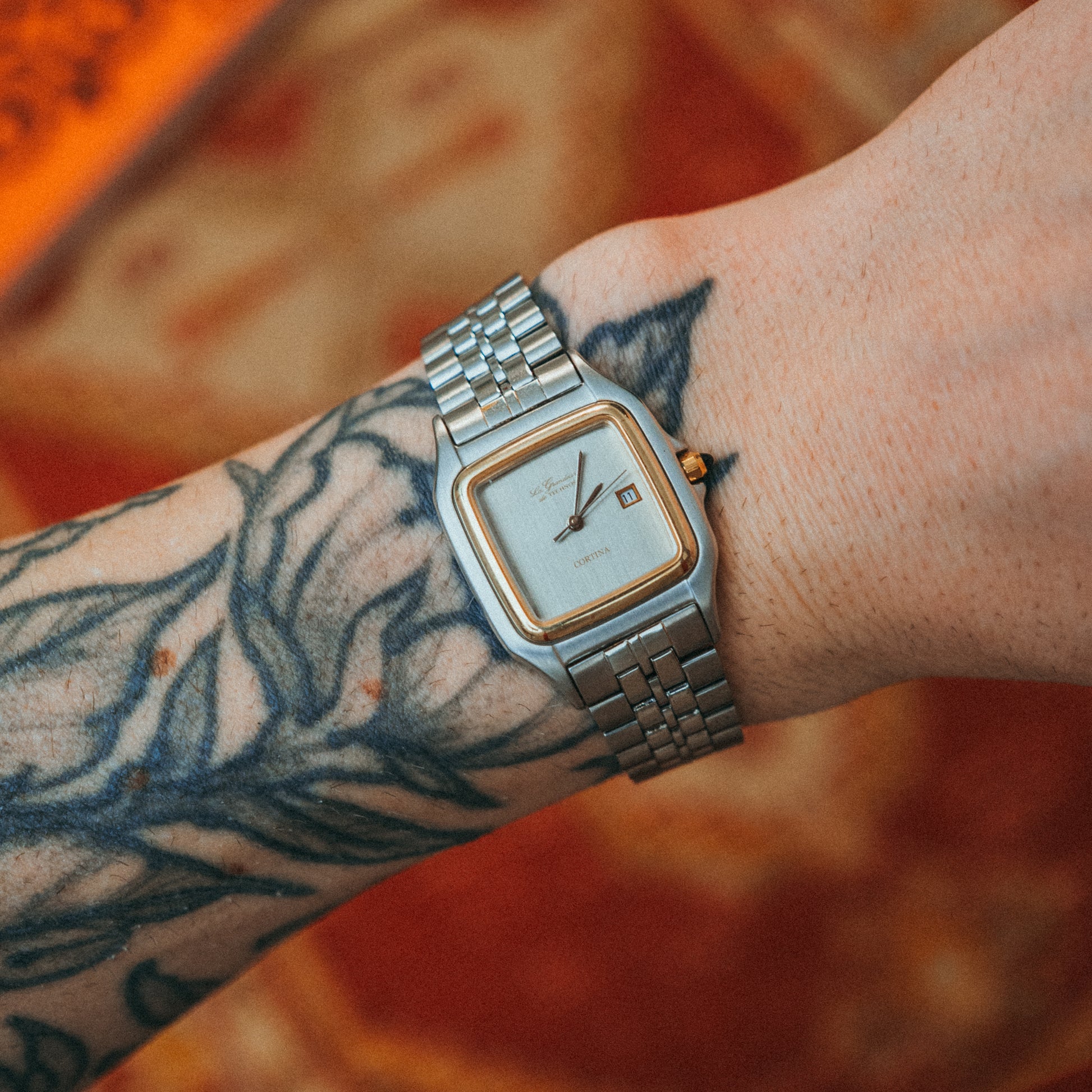A rare and sophisticated expression of 1970s design, this Technos Cortina features an exceptionally elegant "ghosted" dial that sets it apart from its contemporaries. The two-tone stainless steel and gold-plated case features a distinctive cushion shape with clean lines and a warm gold bezel that frames the dial beautifully.