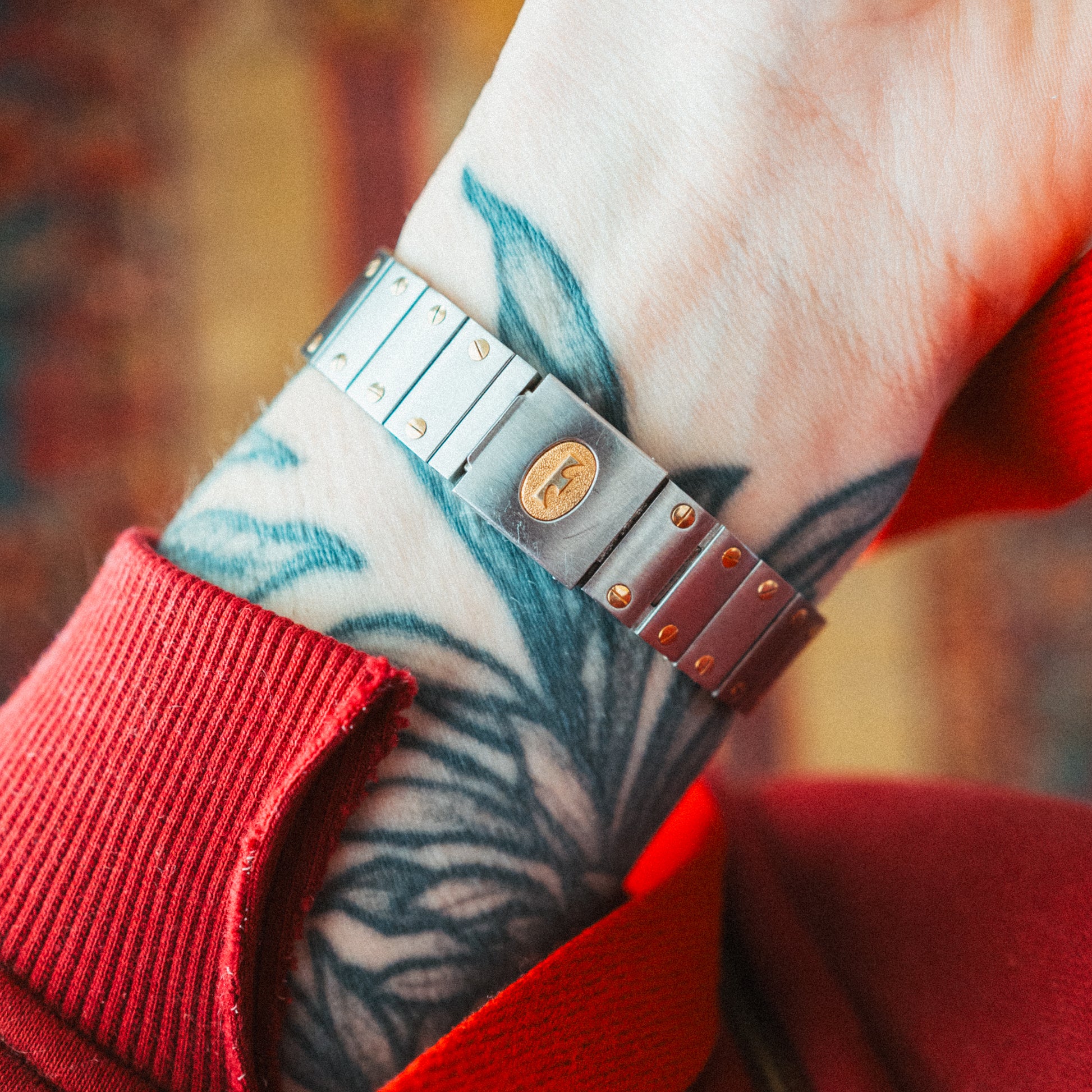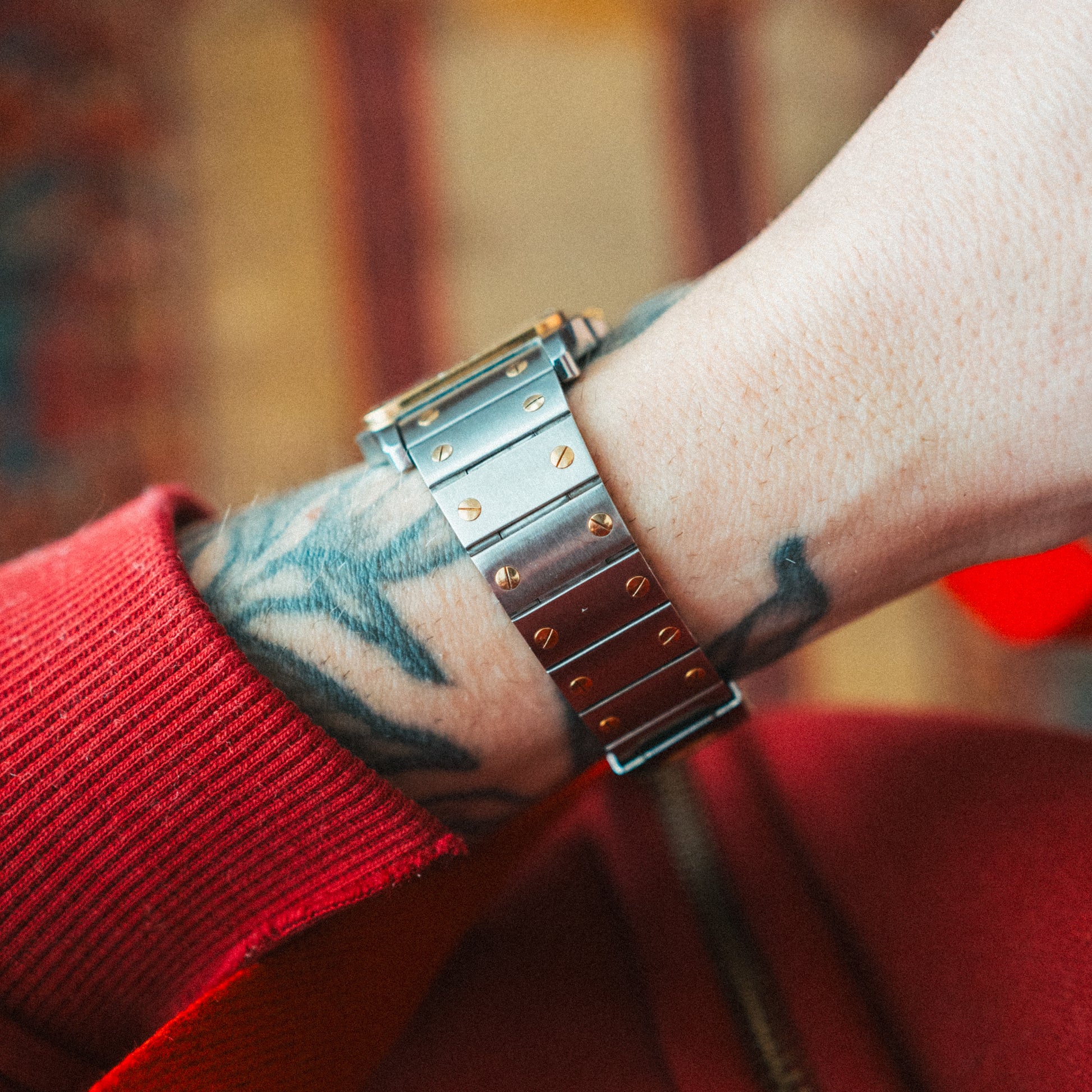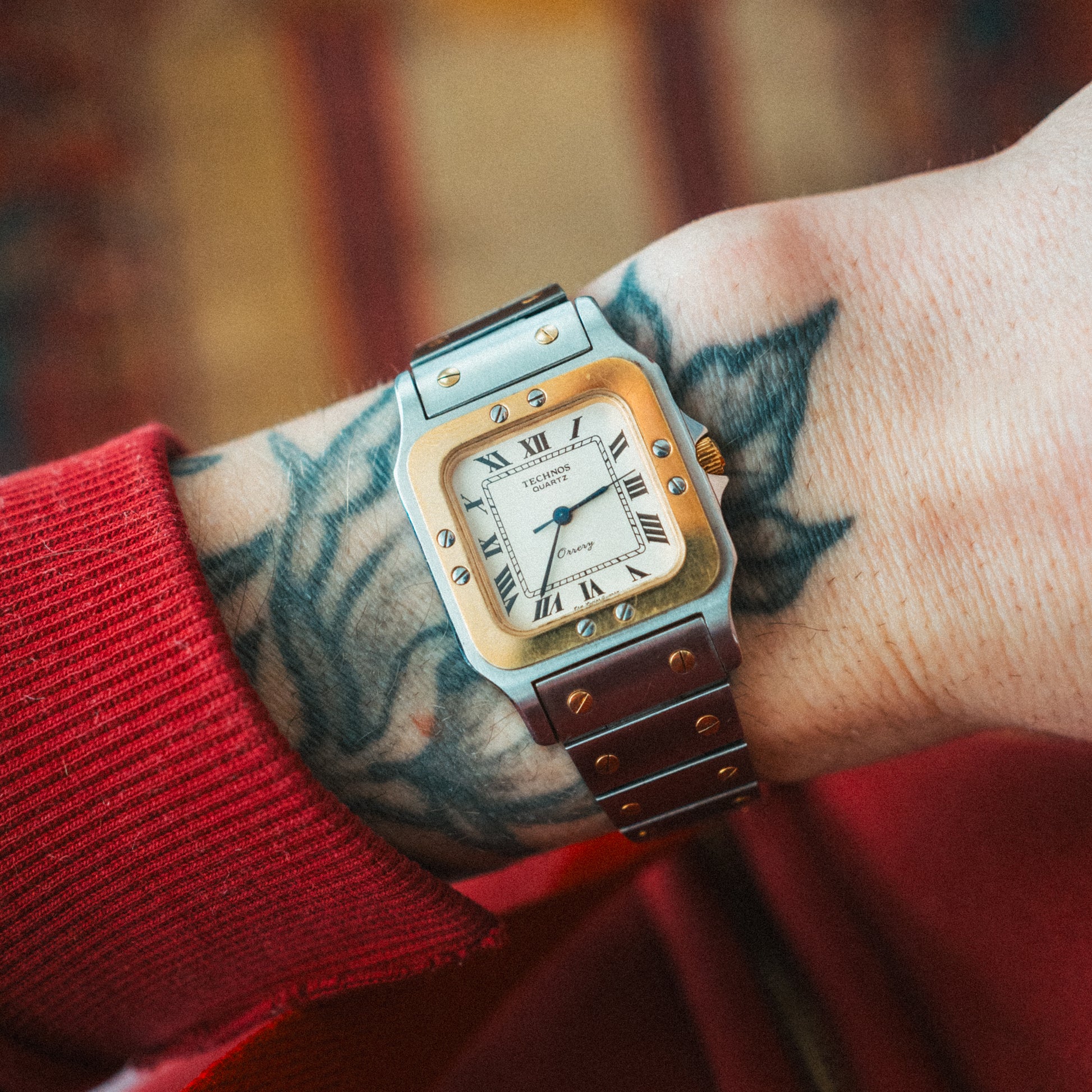 The white dial stays clean and classic, with Roman numeral indices and slender hands that complement the case design. Paired with the integrated two-tone bracelet featuring those distinctive screw details continuing through the links, it sits flush on the wrist in that sleek, era-specific way collectors appreciate.