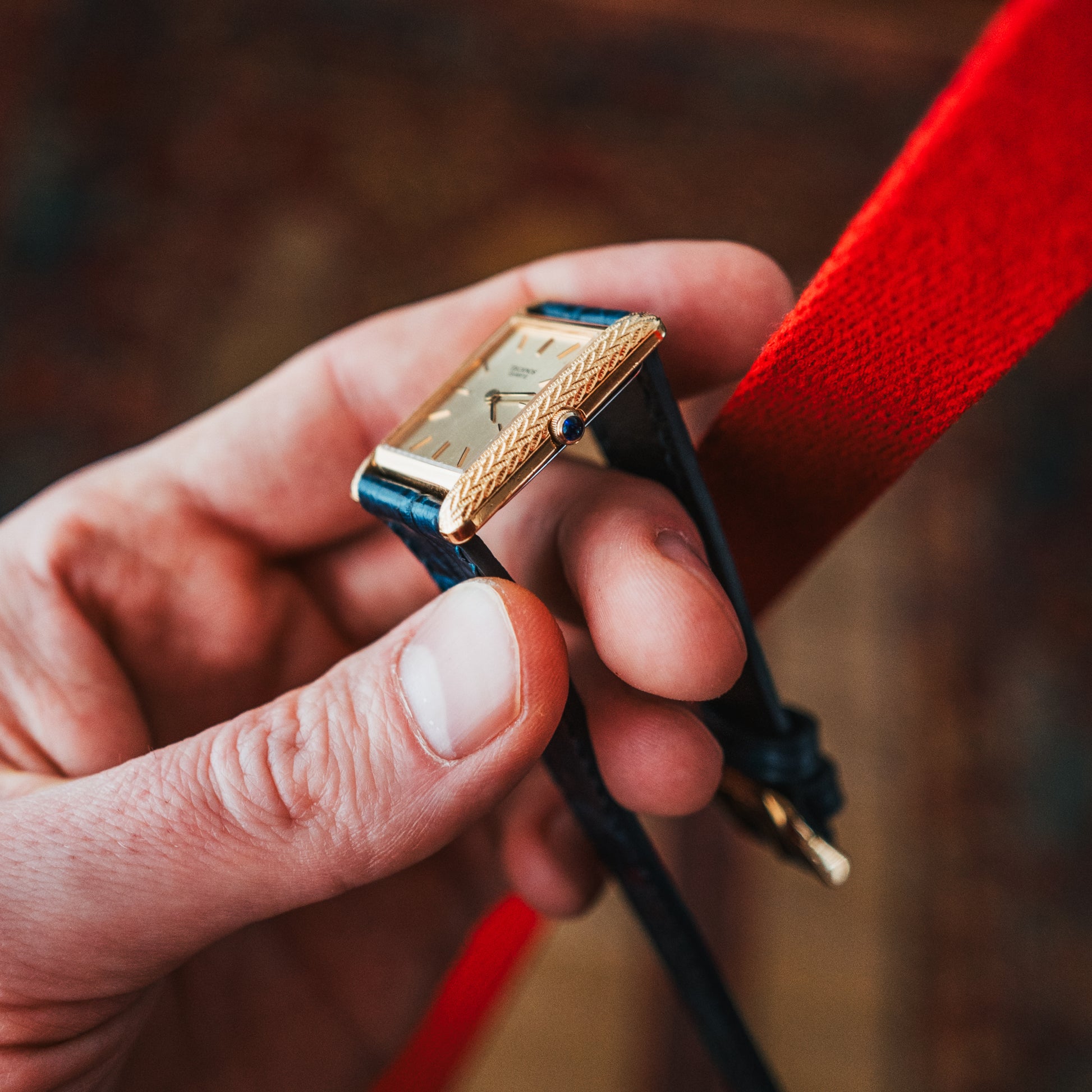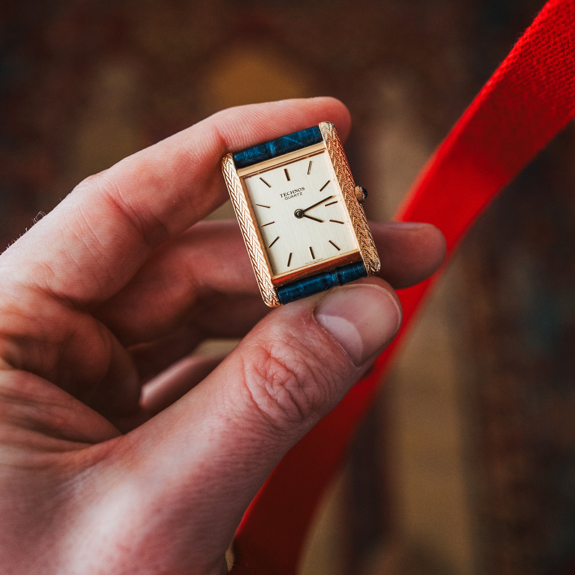 A rare neo-vintage Technos tank watch featuring a distinctive textured case that catches light beautifully, paired with a fresh blue leather strap for a modern touch on classic design.