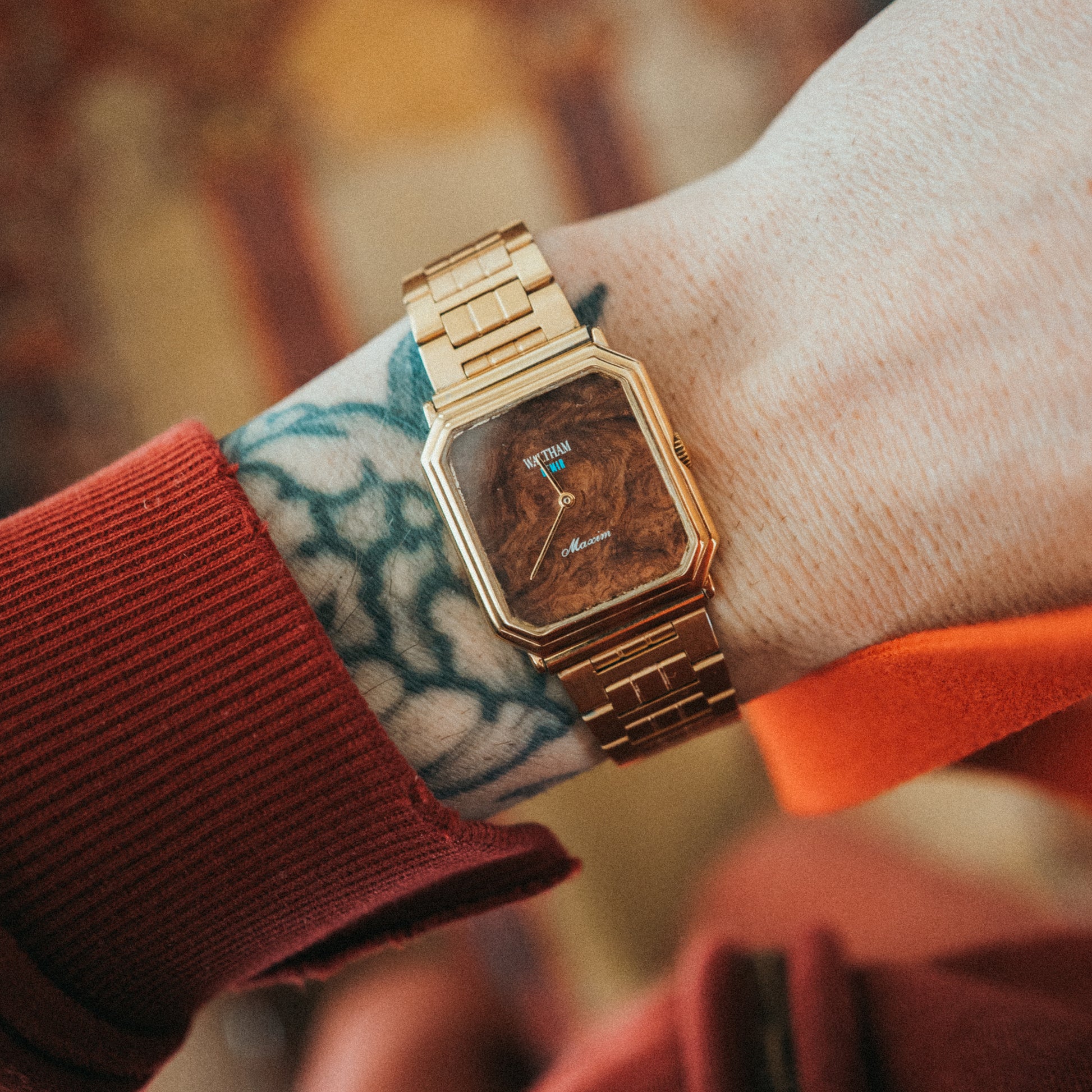 Special Note: New gold bracelet fitted and fattened to match the aesthetic of the case — the wide, substantial links sit flush against the wrist with a presence that feels intentional and complete. The octagonal gold case with chamfered edges frames the burl wood dial with architectural precision, and the “Maxim” script on the dial adds a period-correct elegance. The teal Waltham logo pops against the warm wood tones in a way that feels entirely modern. A true one-of-one.