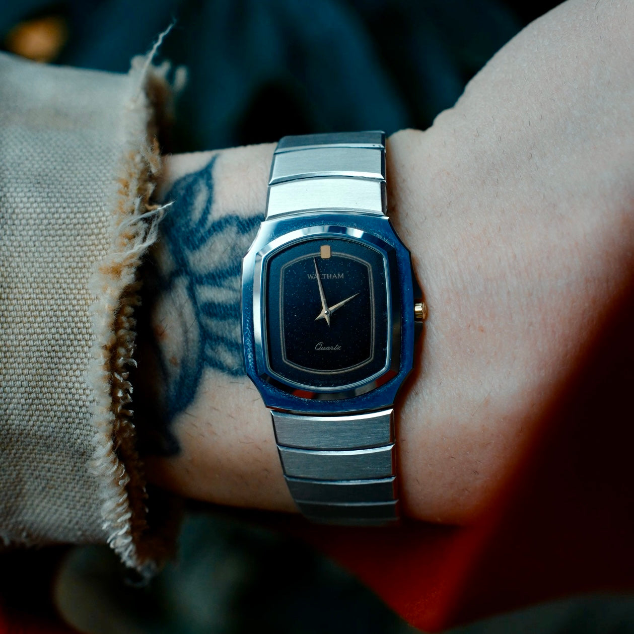 A sharp, architectural Waltham with a rare dial tone and that unmistakable 80s–90s industrial elegance. The rectangular case has real presence — brushed steel, gold accents, and clean geometry that makes it feel like a design object as much as a watch.